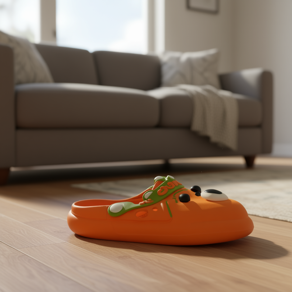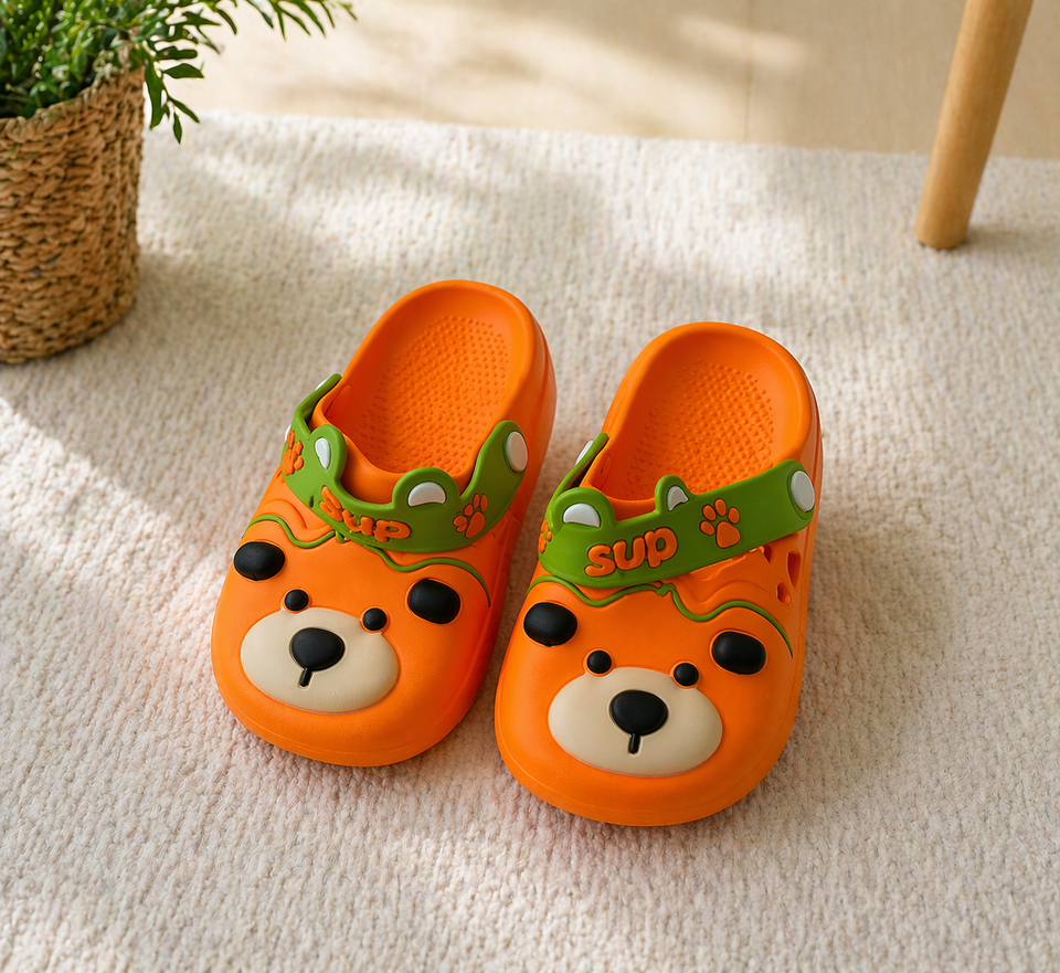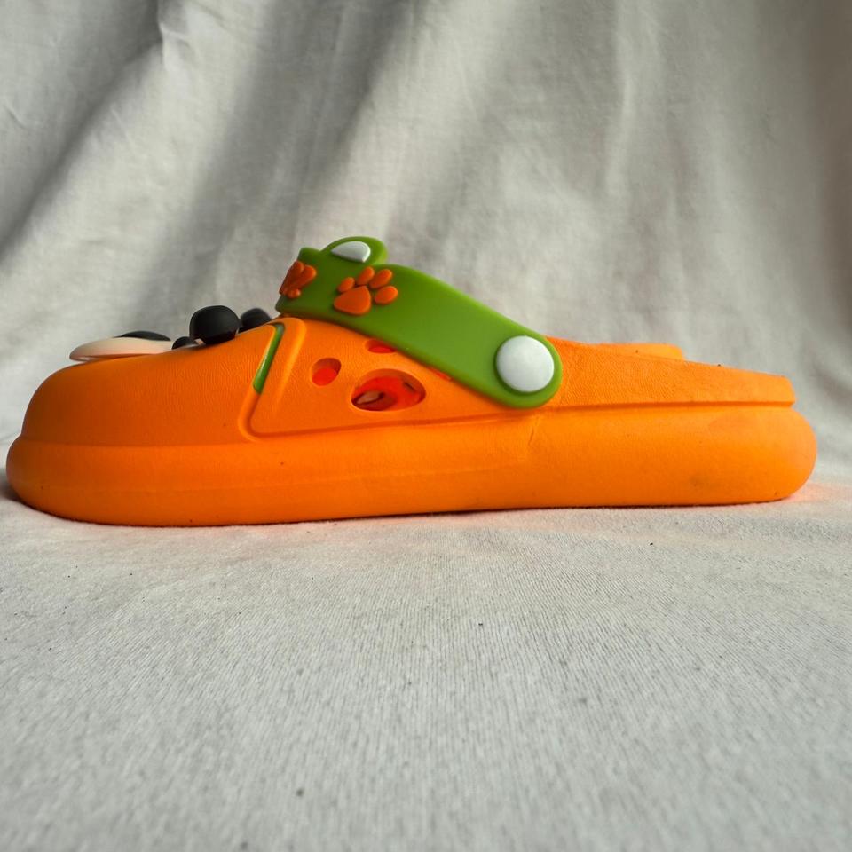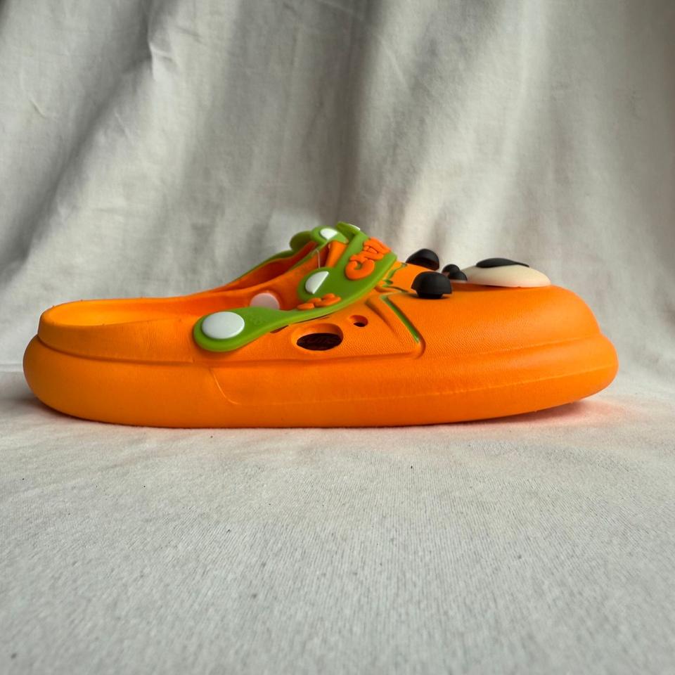 Chaussons de dessin animé pour hommes, orange, dessus en PVC, semelle EVA, usage décontracté estival, à enfiler, bout rond, épaisseur 15 mm, logo imprimé en 3D