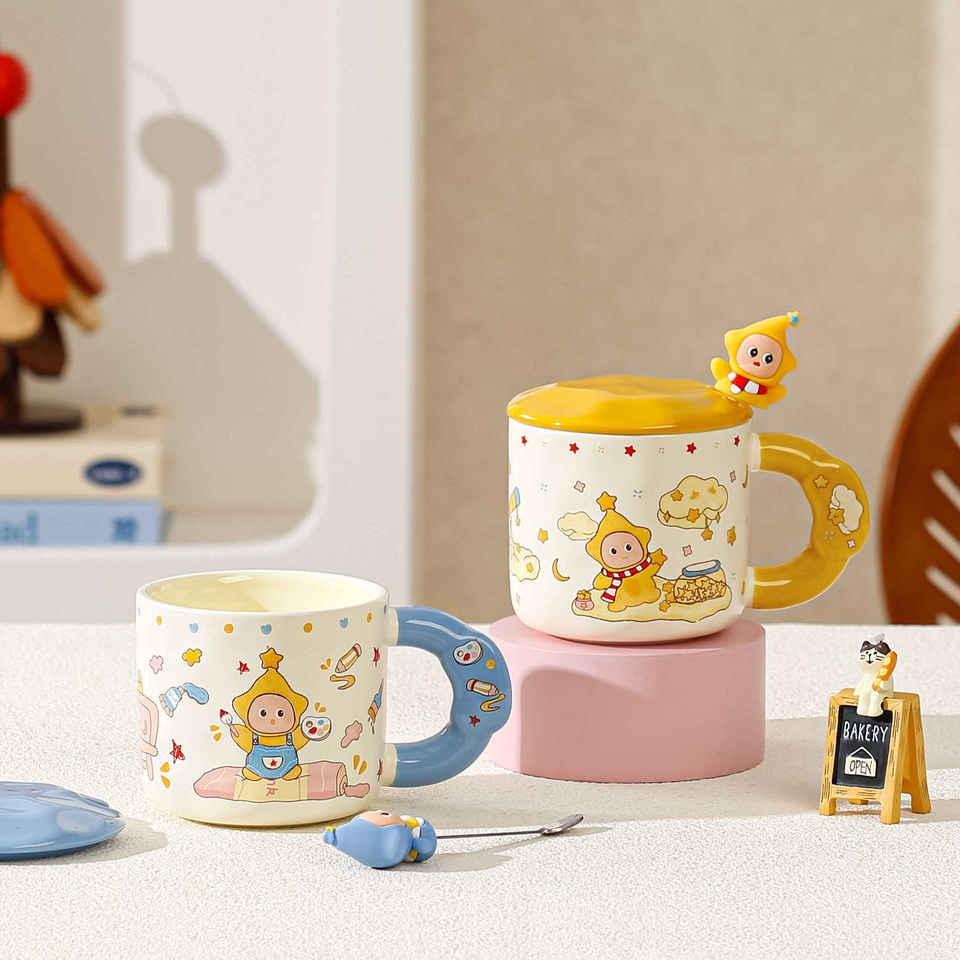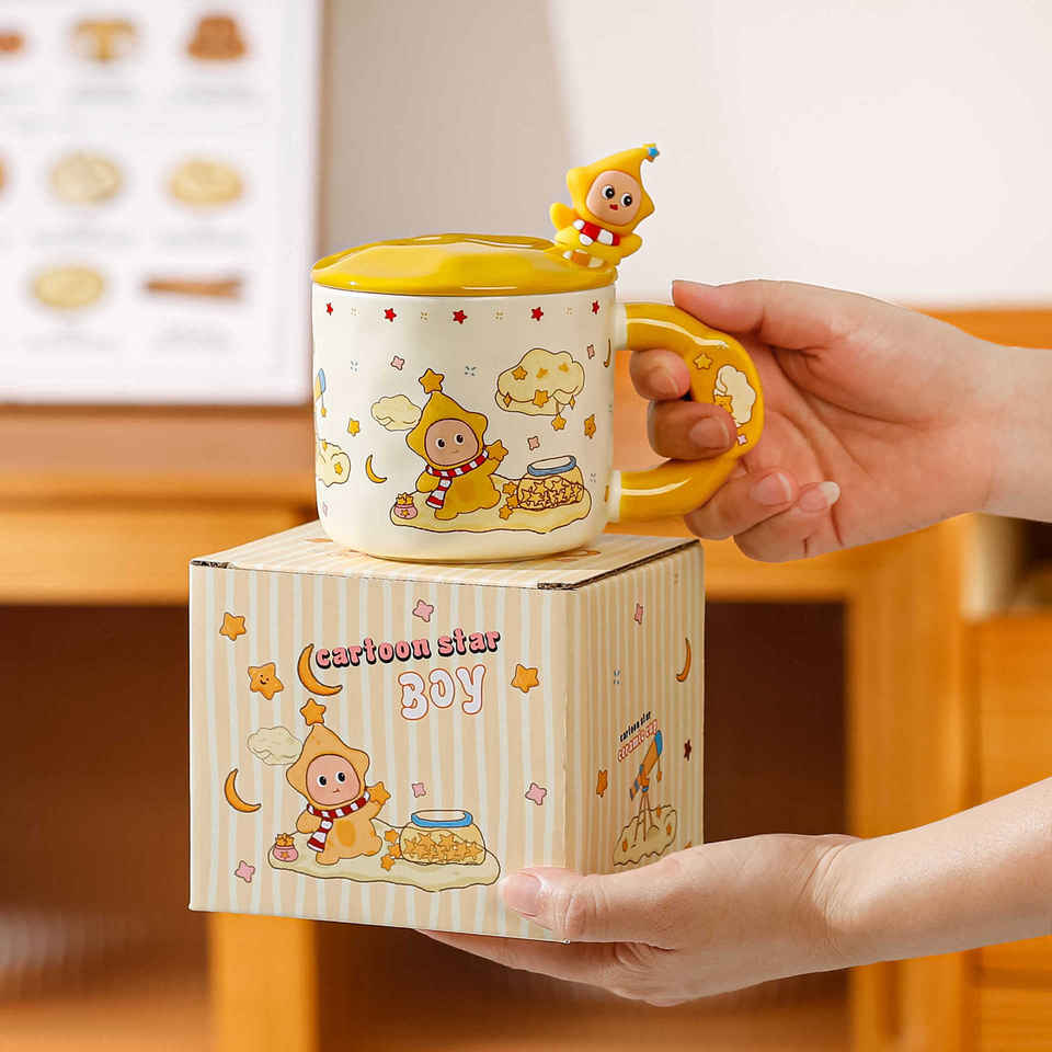 Mug en céramique Cartoon Star Boy avec couvercle et cuillère, tasse individuelle pour la maison ou le bureau