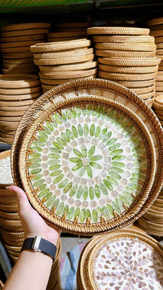 Plateau de service en rotin de bambou sculpté Décoration de maison unique avec incrustation de nacre pour la cuisine et le service des aliments