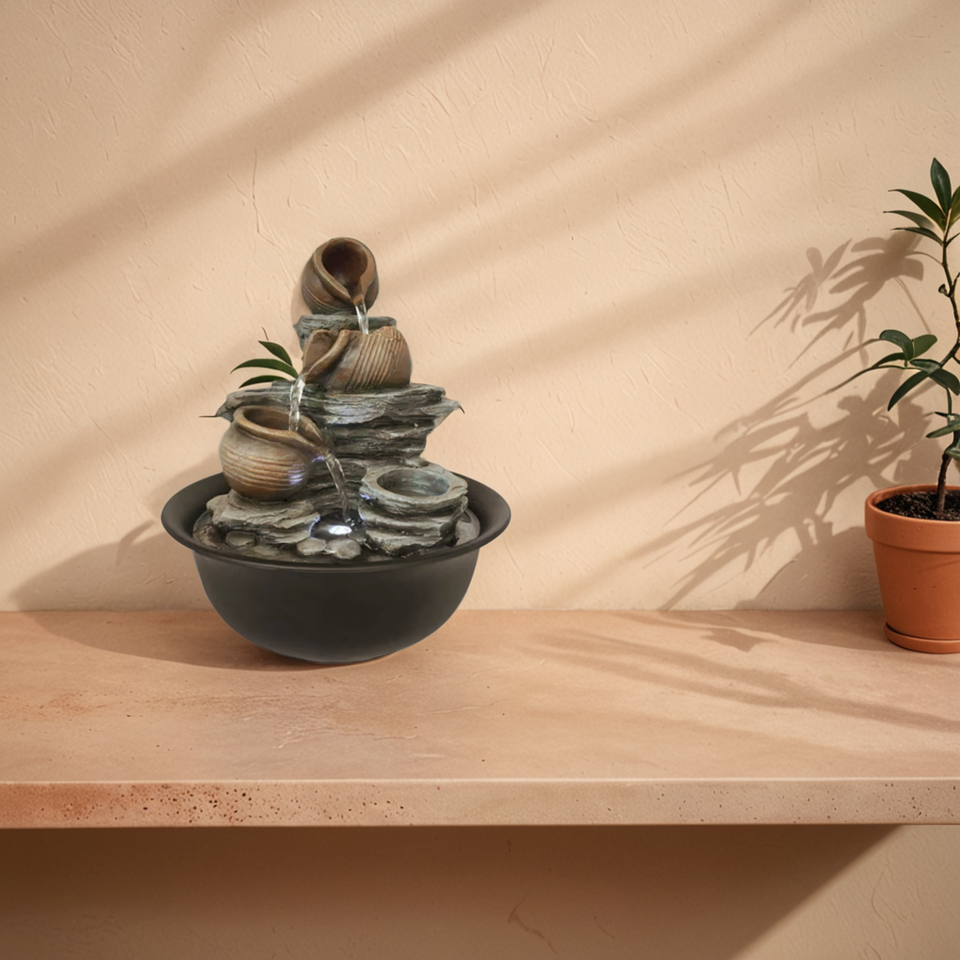Fontaine à trois pots en cascade avec décoration aquatique