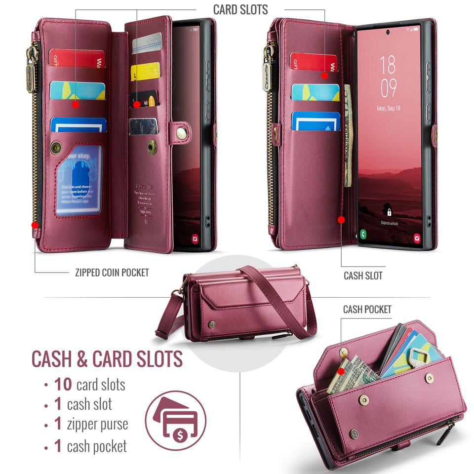 Étui portefeuille en cuir à bandoulière CaseMe pour Samsung S25 Edge S24 Ultra S23 Plus S22 S21 FE S20 S10 Bandoulière Poche zippée