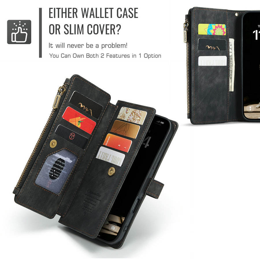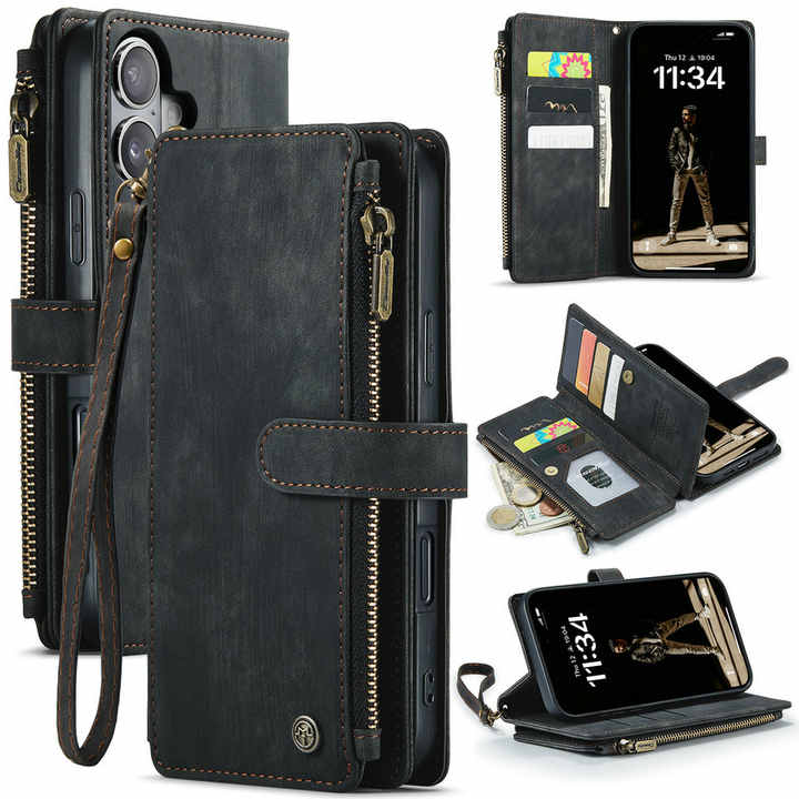 CaseMe Retro PU Housse en cuir pour iPhone 17 Portefeuille Fentes pour cartes Sacs Fermeture éclair Stand Pouch pour iPhone 17 16 Pro 15 Plus 14 Flip Case