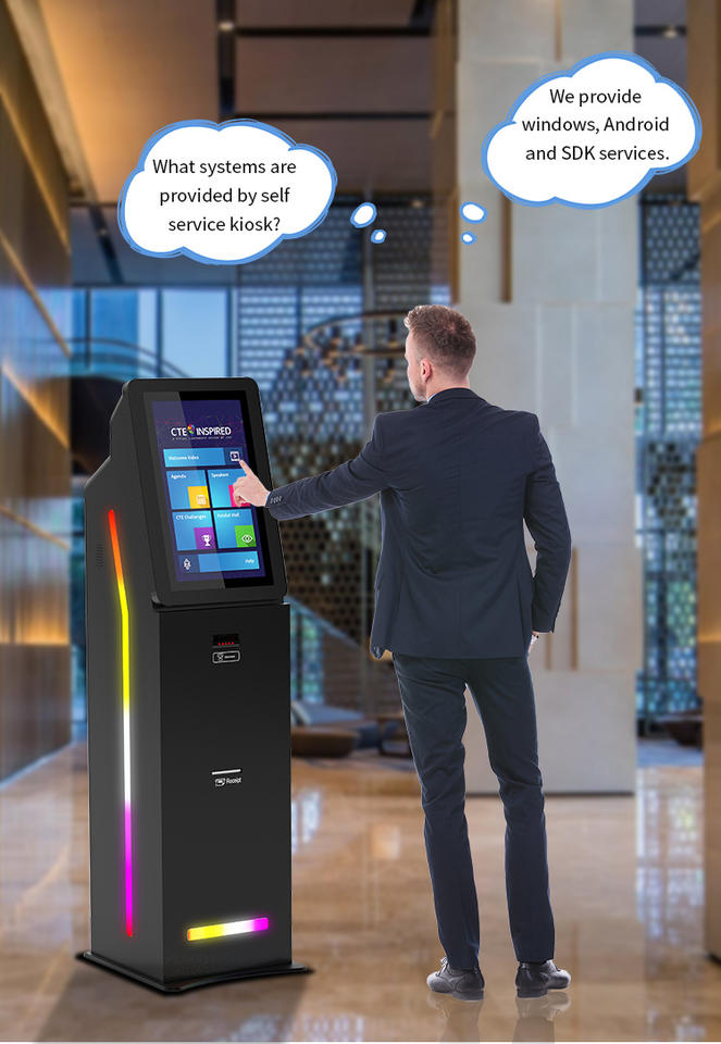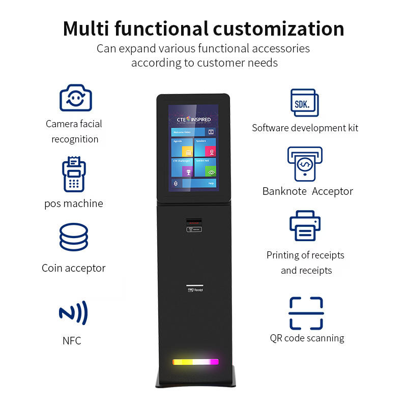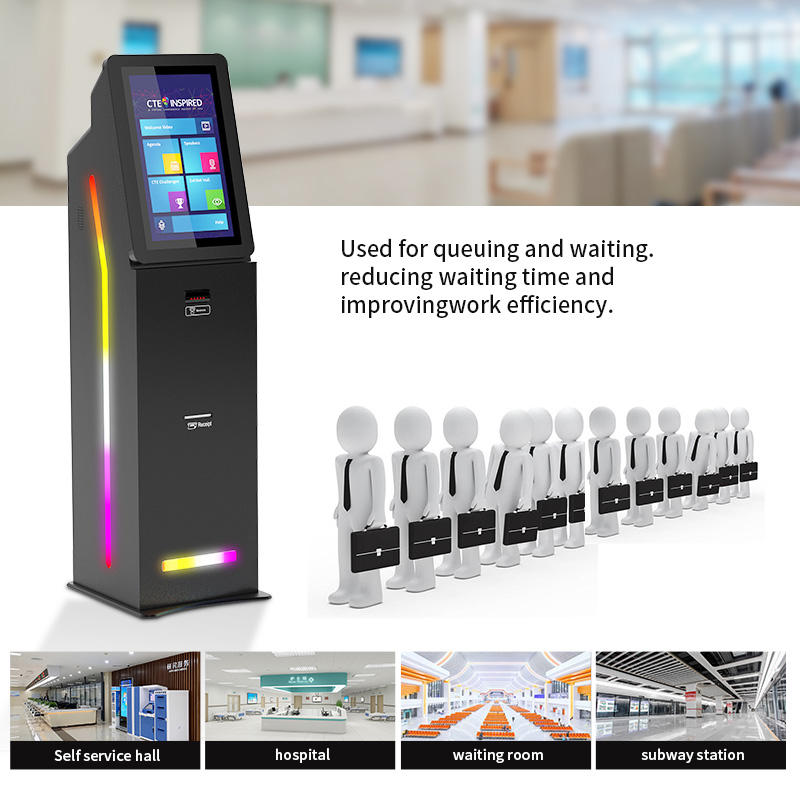 Requête en libre-service, paiement sans numéraire,:Gestion de file d'attente, impression de reçu