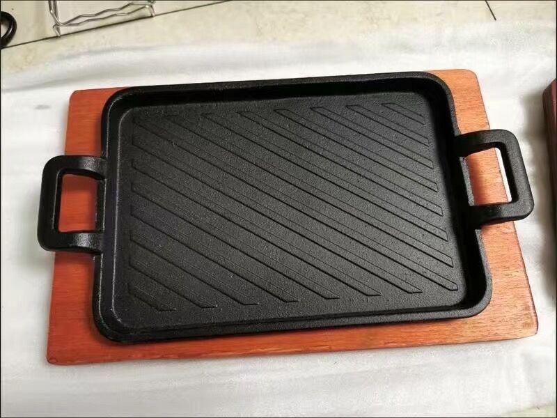 Assiette de barbecue en forme de rectangle en fonte avec deux poignées Assiette à steak avec base en bois