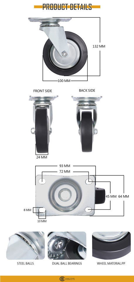 Roue pivotante en PVC de 4 pouces avec tige filetée de 3/8 pouces, roue en PP