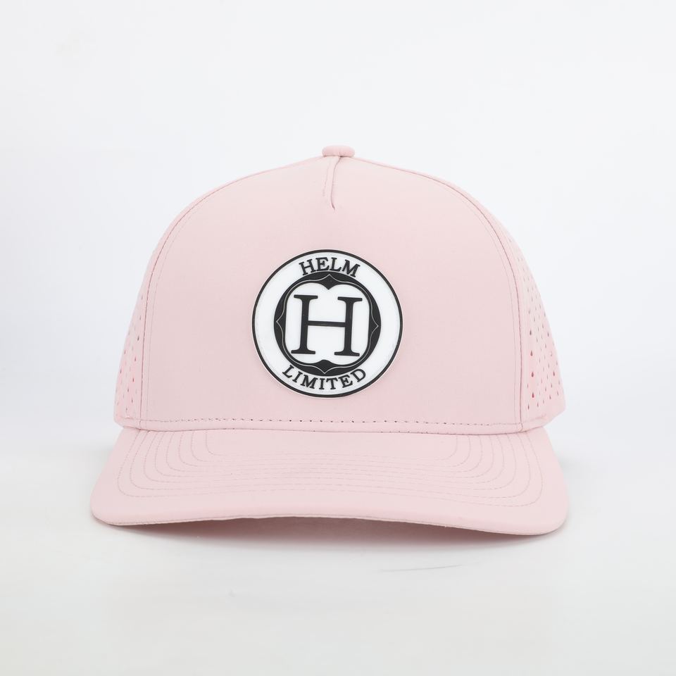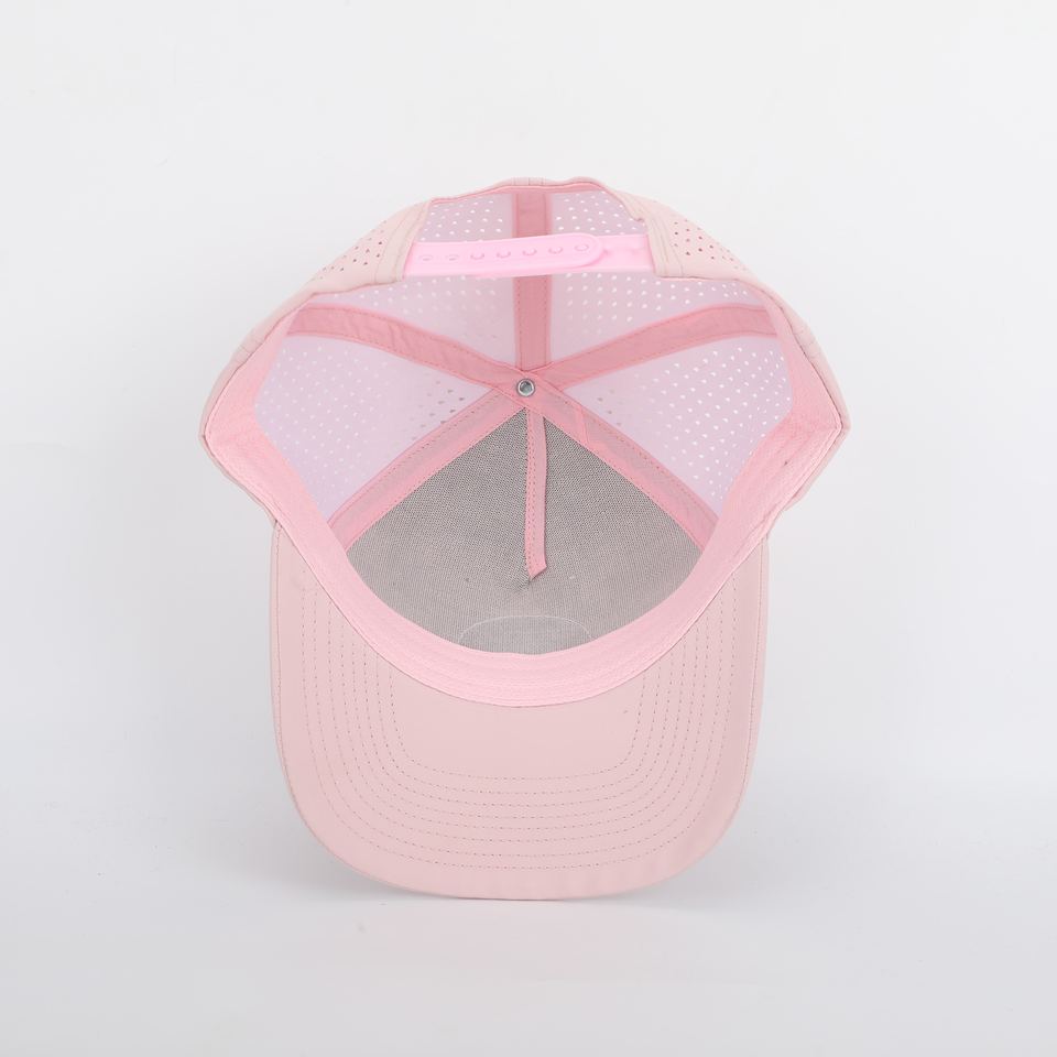 Casquette de baseball en polyester rose à 5 panneaux décontractée avec design perforé découpé au laser pour un usage quotidien Chapeau en caoutchouc à logo de style relax pour l'extérieur