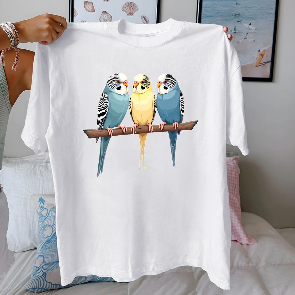 Casual Print Style Three Budgerigars on Branch Tshirt Comfort Fit 100% Pure Cotton for Women