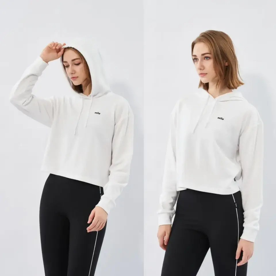 Casual Short Crop Hoodie Women's Relaxed Fit Knitted Eco-Friendly Breathable Front Logo White Sweatshirt Soft Fashion Gym Top