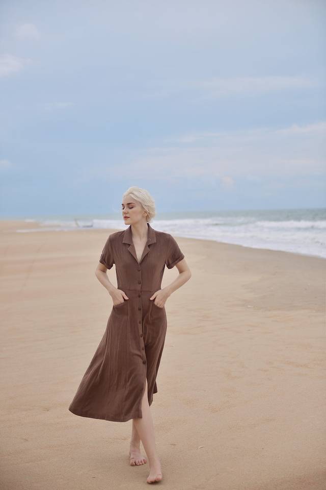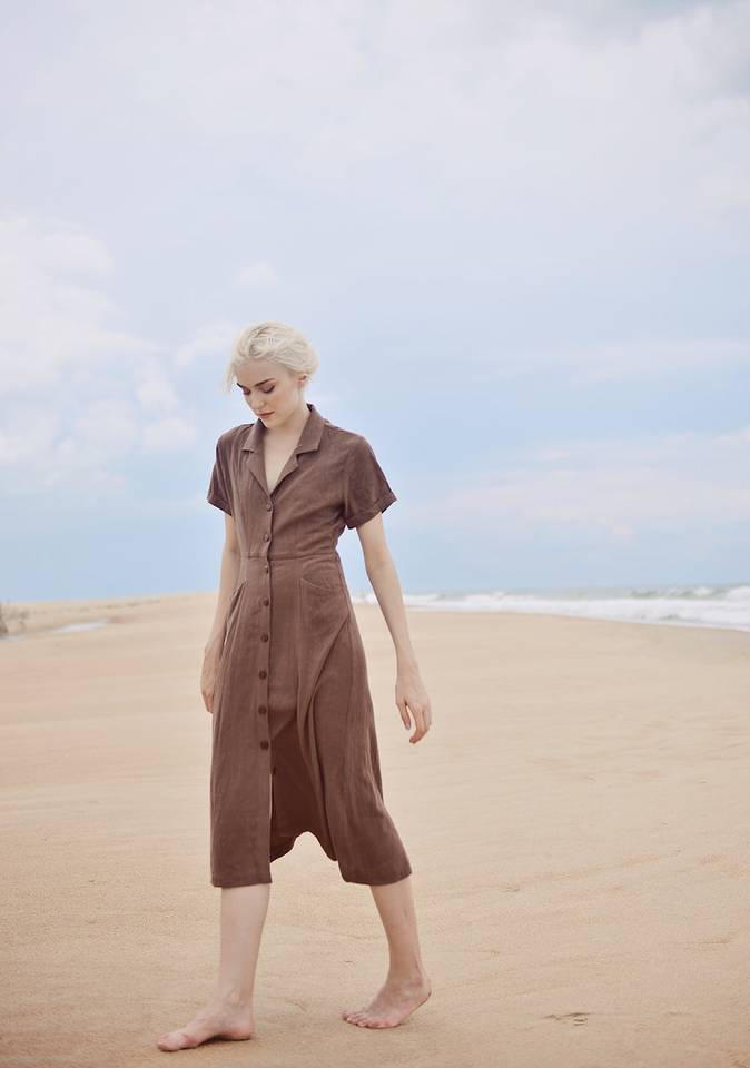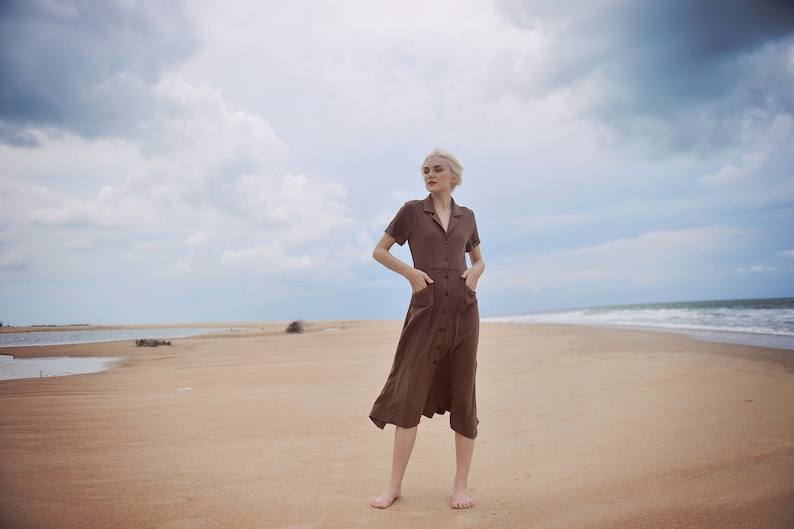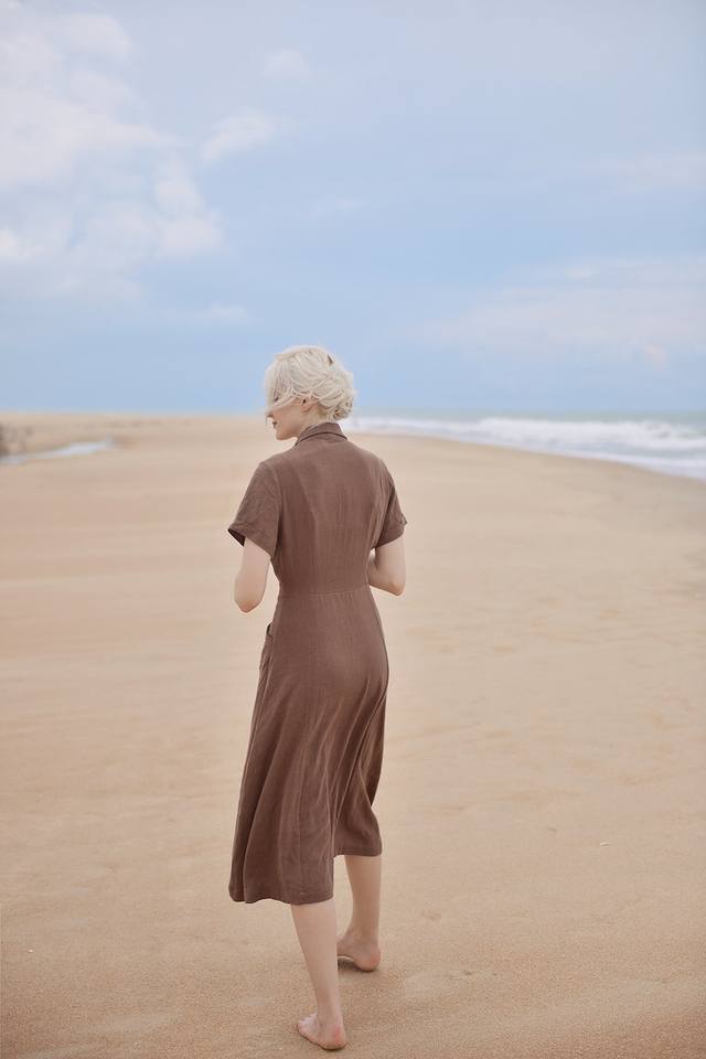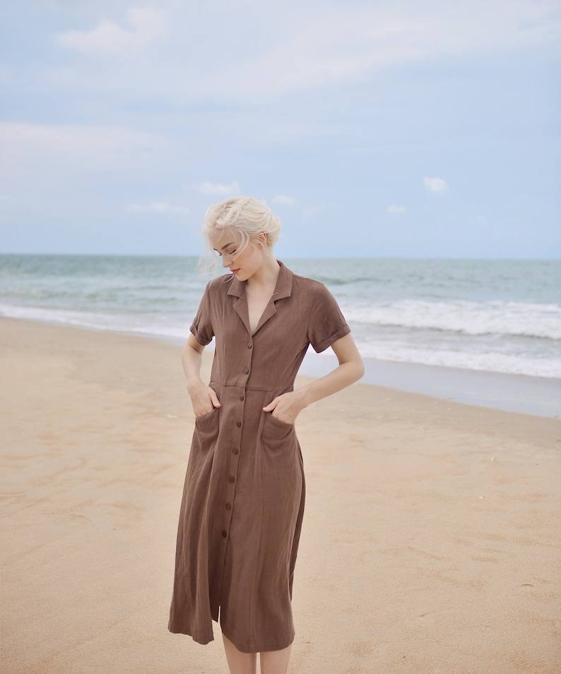 Robe décontractée en coton intemporel Motif floral Mélange de lin léger Manches courtes Boutons Taille naturelle-une agrafe de garde-robe