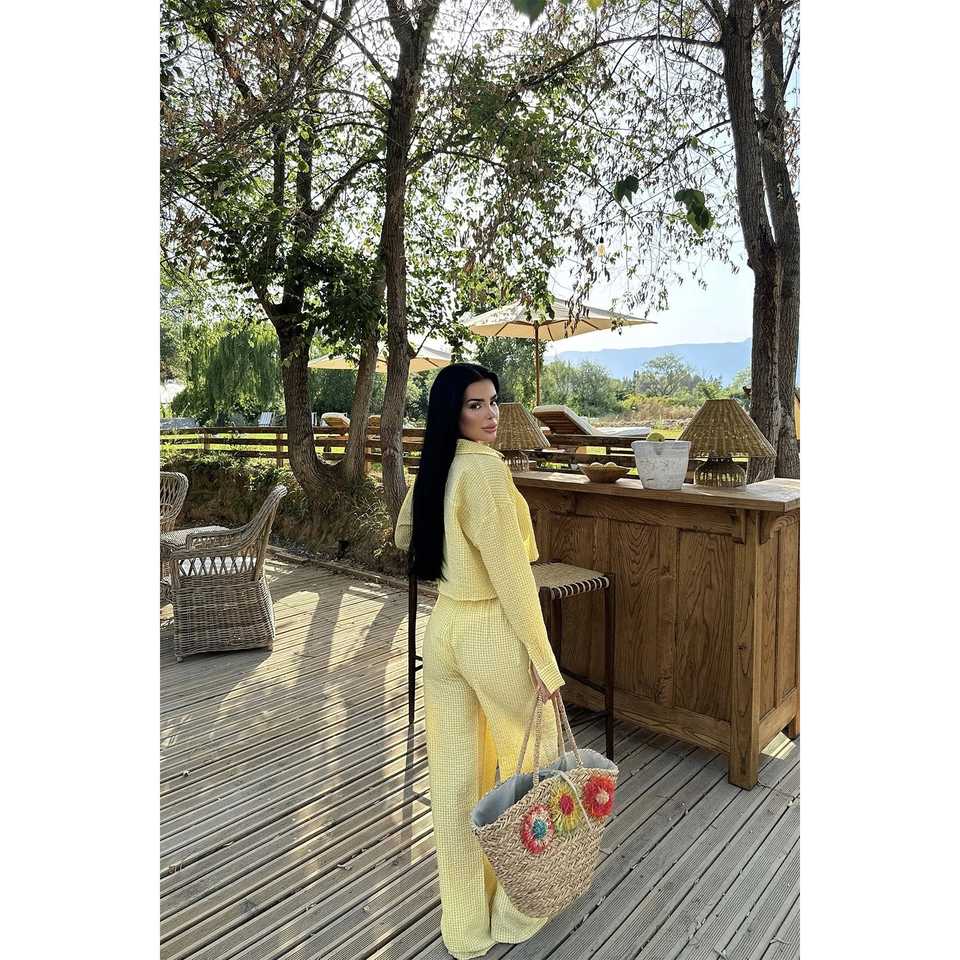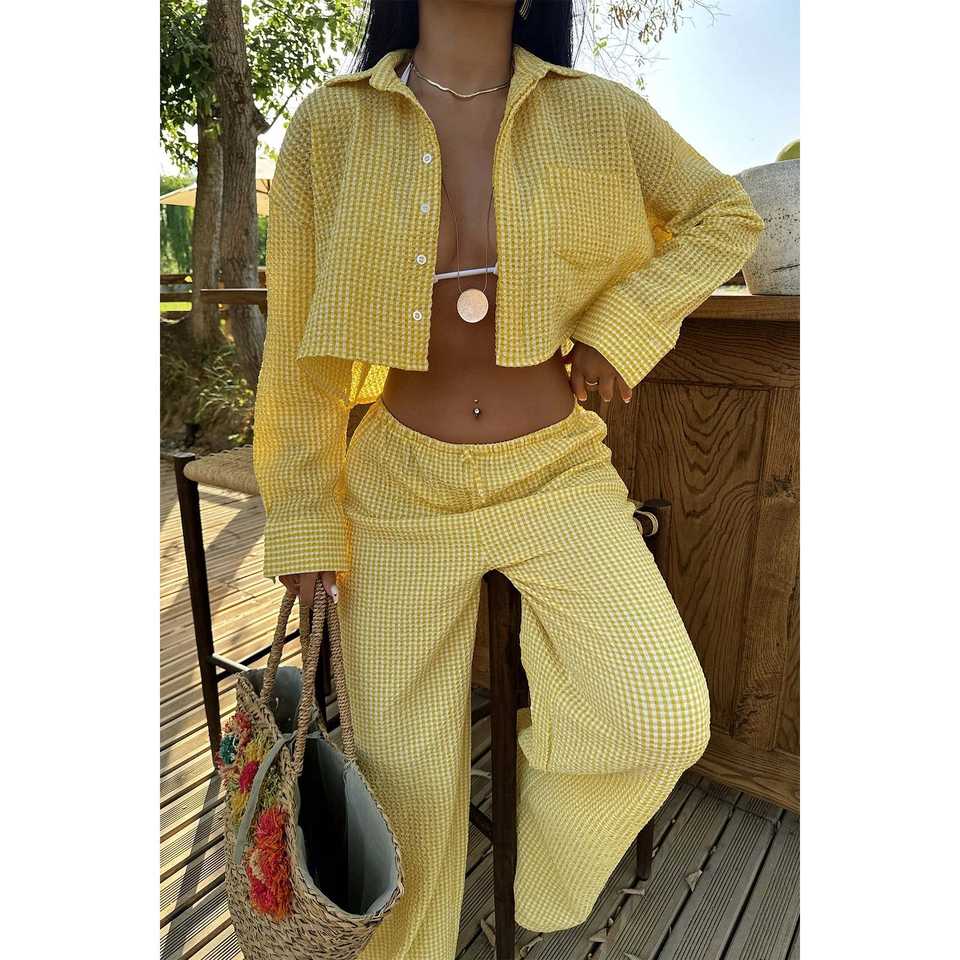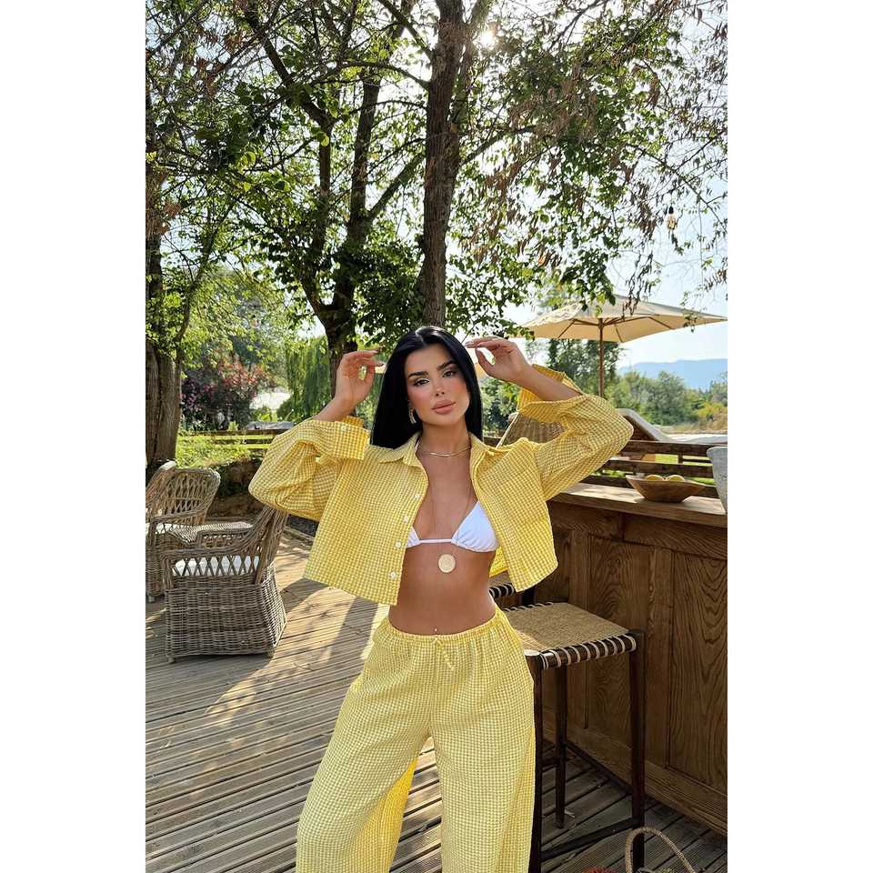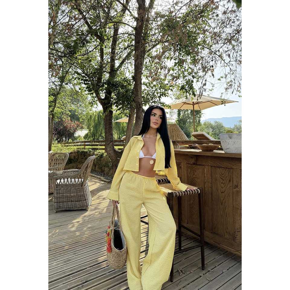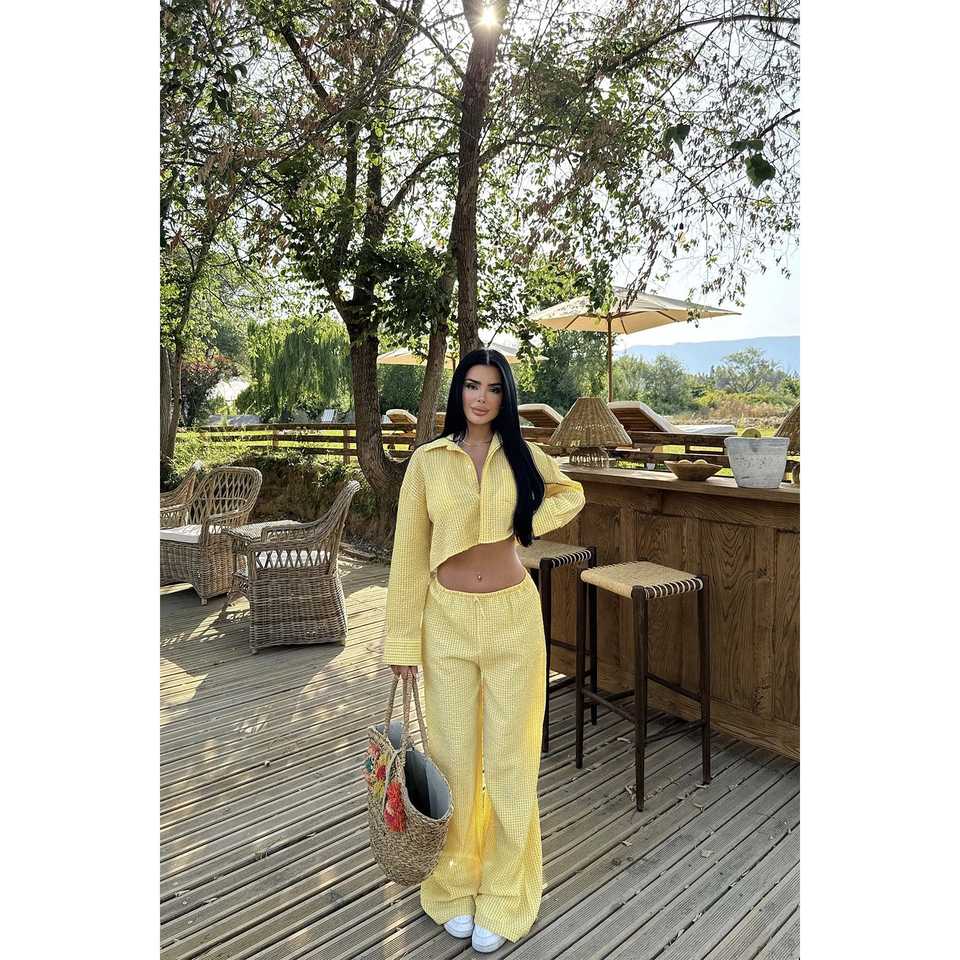 Casual Yellow Plaid Set with Hooded Collar Embroidered Knitting Fabric for Summer Autumn One Set Includes Top Shorts Bow Pants