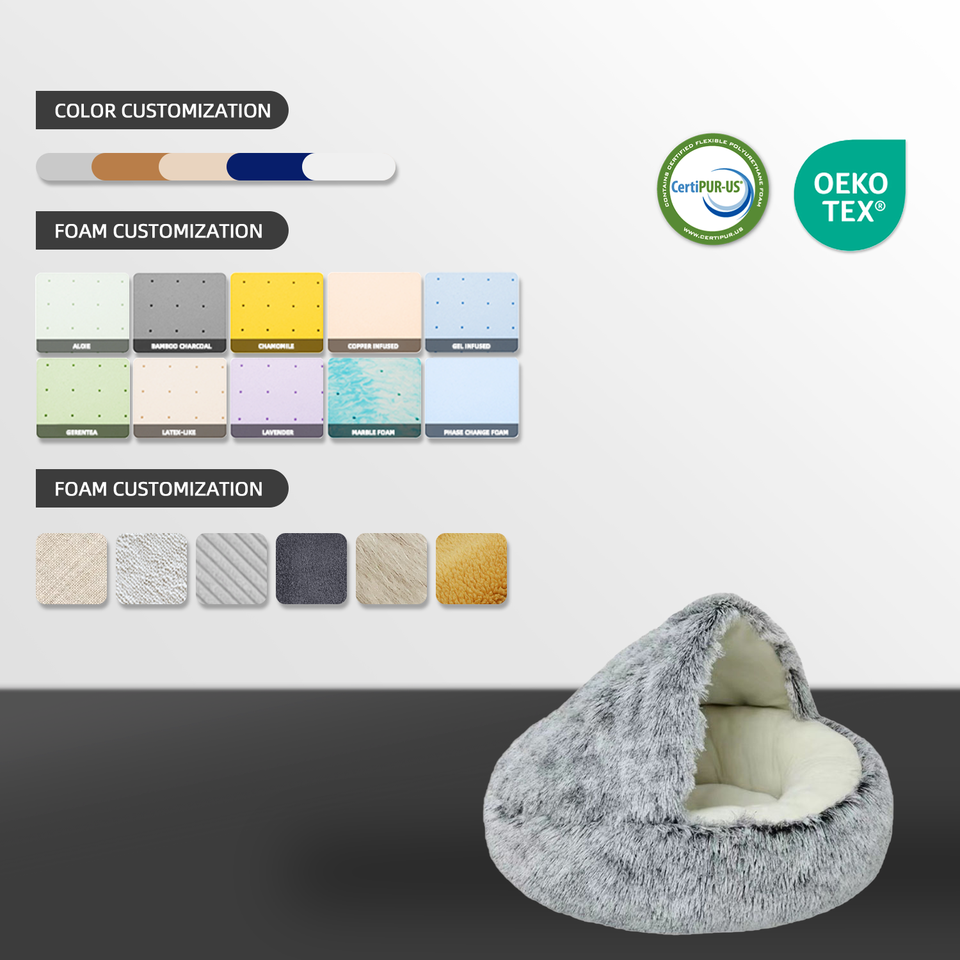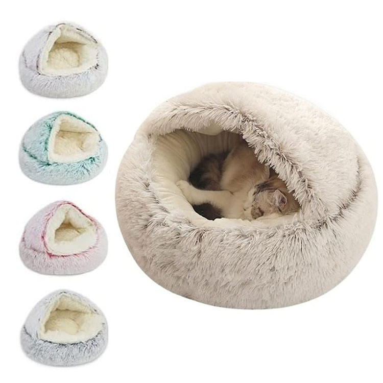 Lit rond en coton pour chat en peluche moelleux à capuche apaisant nid de grotte pour chat avec couverture non effondrée