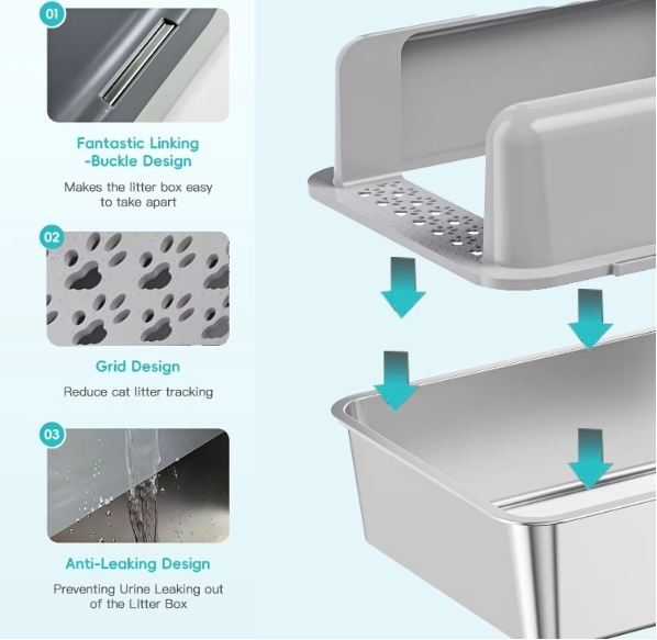 Bac à litière pour chat 20L, design ouvert, acier inoxydable, sans poussière, facile à nettoyer, contrôle des odeurs, grande capacité pour chats de tous âges