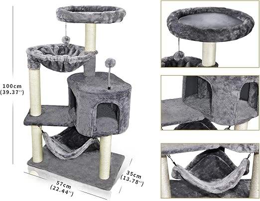 Arbre à chat moderne de luxe en sisal avec condo pour chat et grand hamac, 4 niveaux, hauteur réglable, emballé en carton, gris