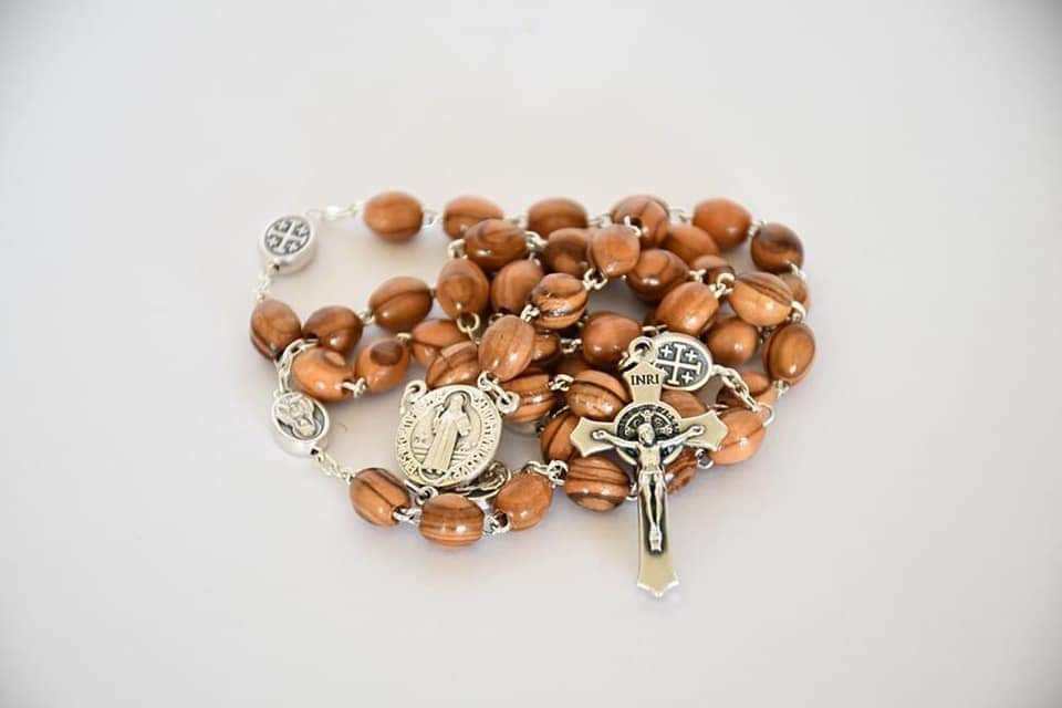 Catholic Prayer Rosary Necklace 6x8mm Olive Wood Beads with Holy Soil Medal & Polished Metal Cross Religious Jewelry