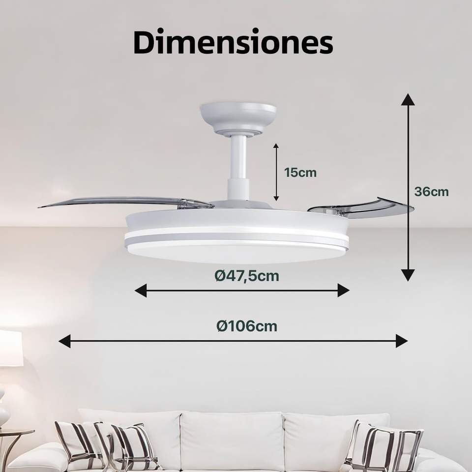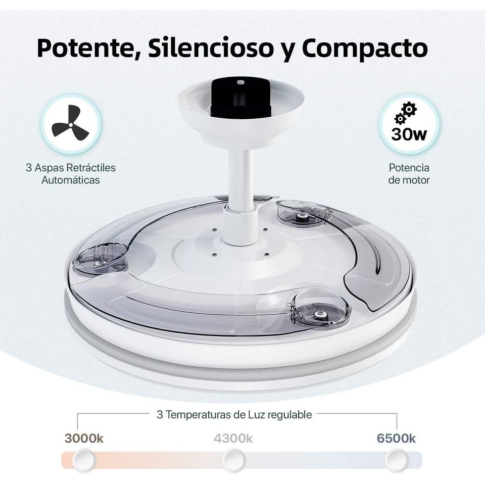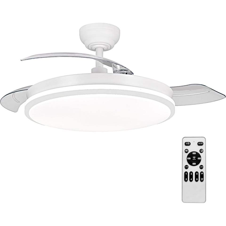 Ventilateur de plafond avec lumière, télécommande, 3 pales, moteur DC 30W + lumière LED, minuterie, 6 vitesses, pales rétractables, 3