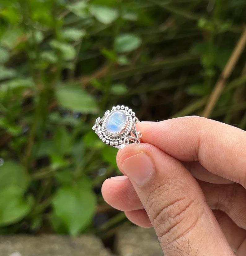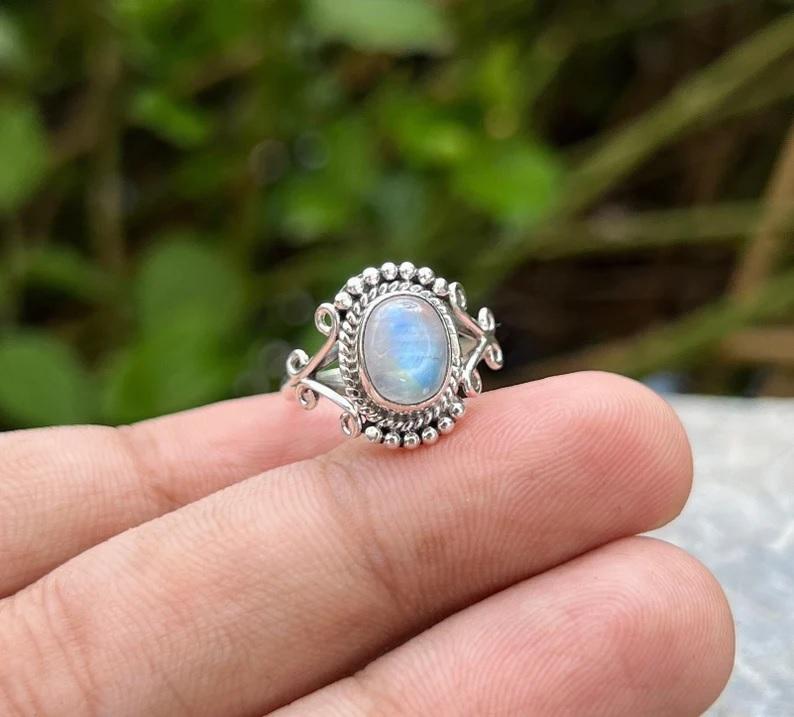 Nom:Bague argentée en pierre de lune arc-en-ciel