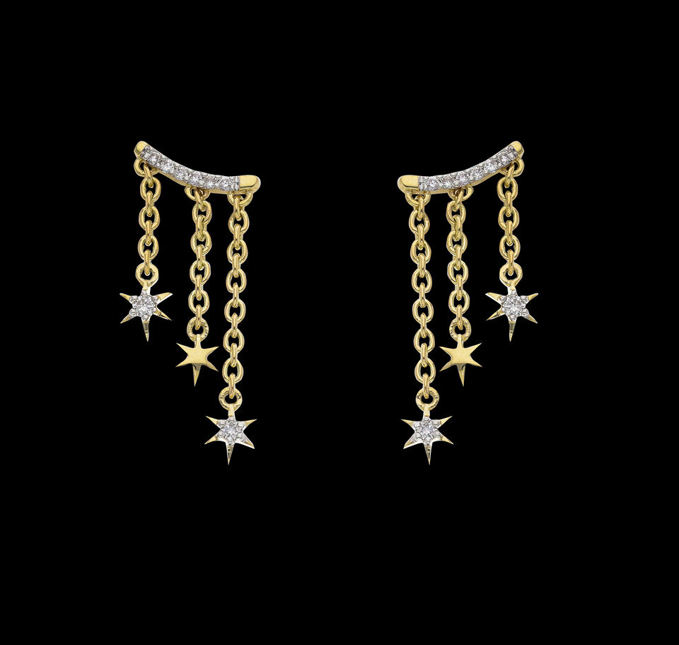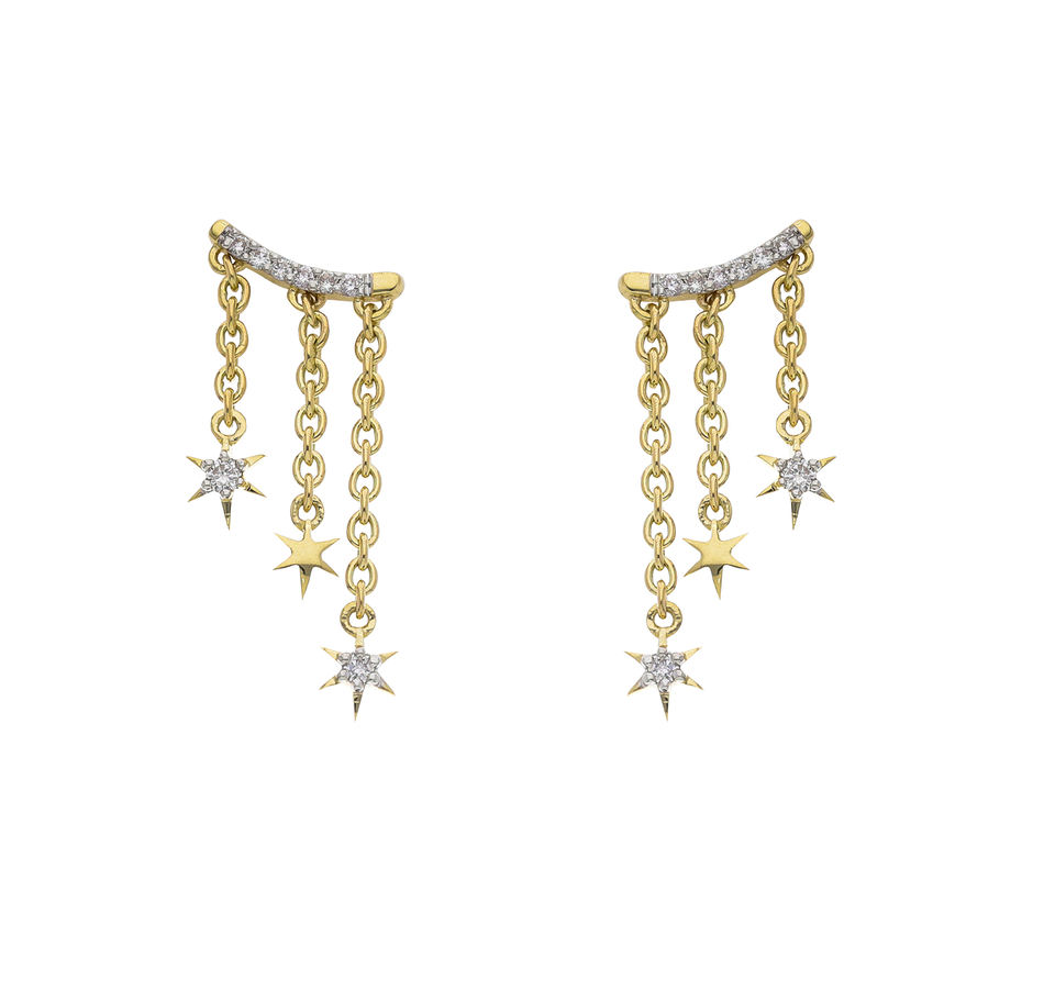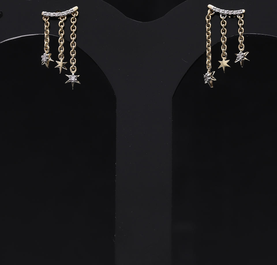 Boucles d'oreilles en or jaune 14 carats plaqué rhodium d'inspiration céleste, diamants naturels taille brillant, breloques étoiles pendantes, design goutte
