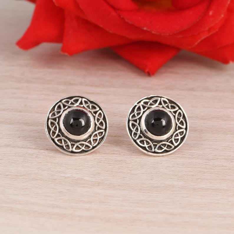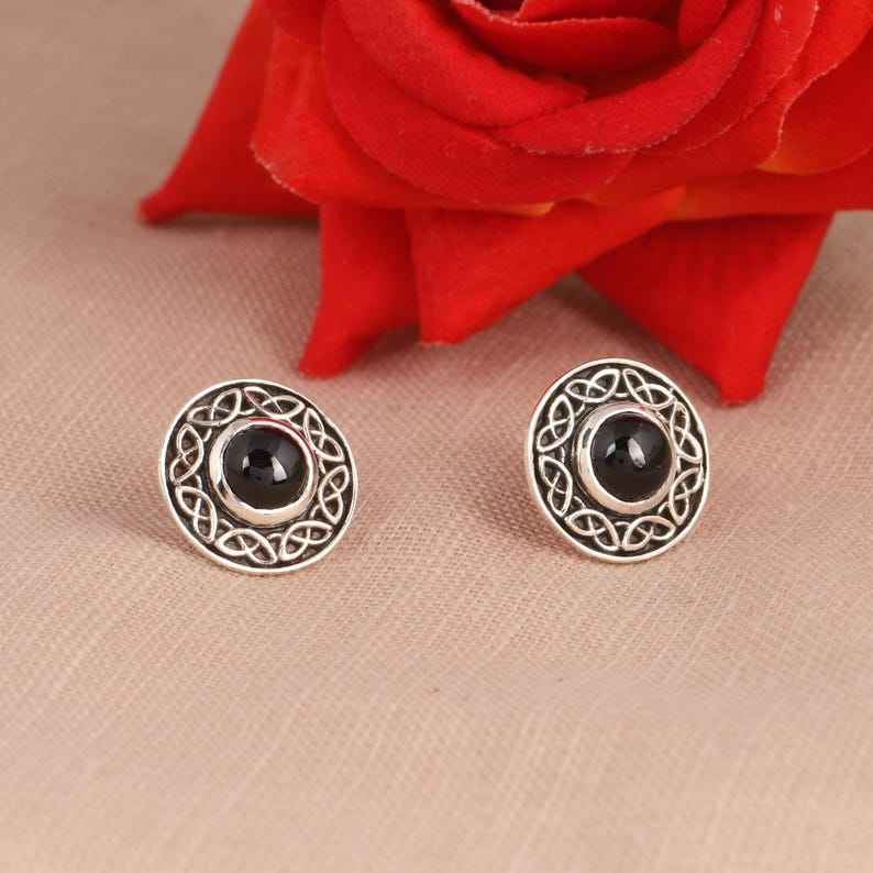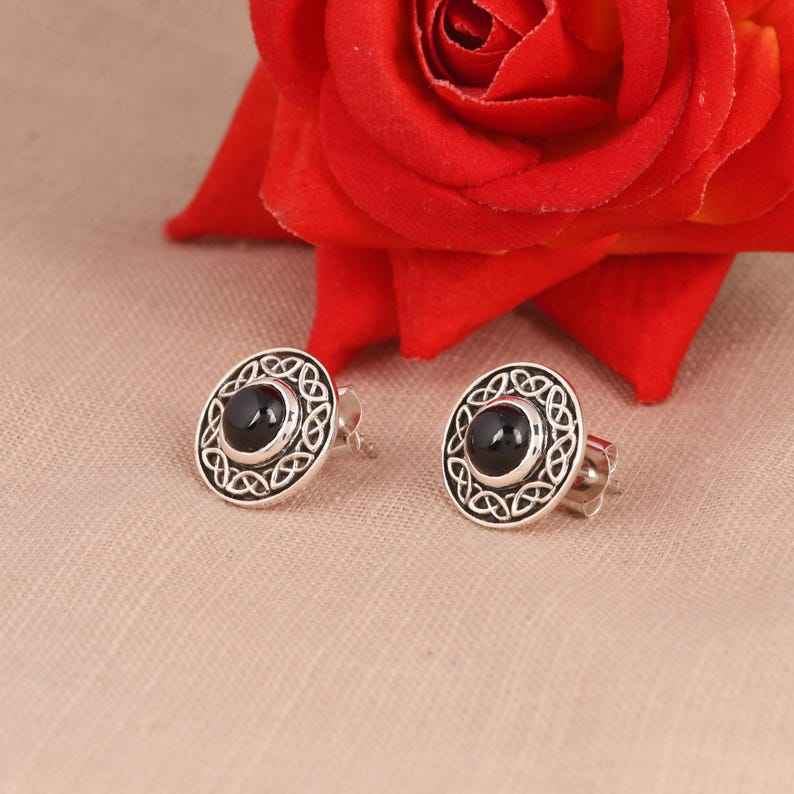 Celtic Knot Stud Earrings With Black Spinel 925 Sterling Silver Womens Gothic Boho Jewelry
