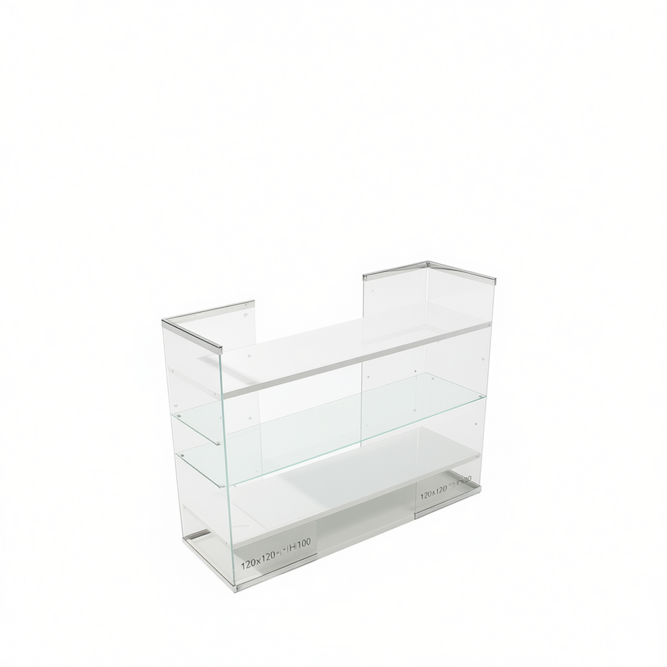 Étagère d'angle centrale 120x120x H 100 en verre blanc brillant pour vitrine de magasin de détail