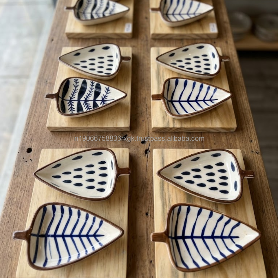 Ensemble de plats de service en céramique en forme de feuille avec base en bois, plateau à collations pour le service à table et la décoration de la maison
