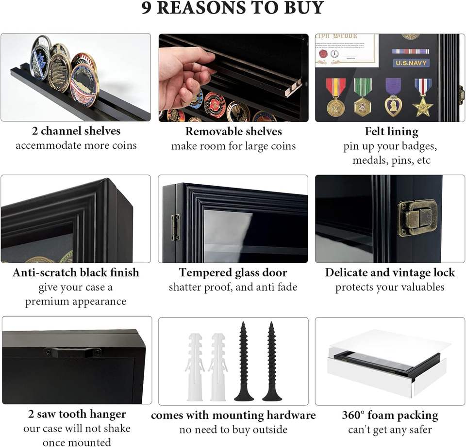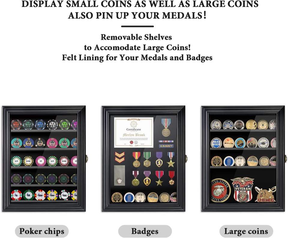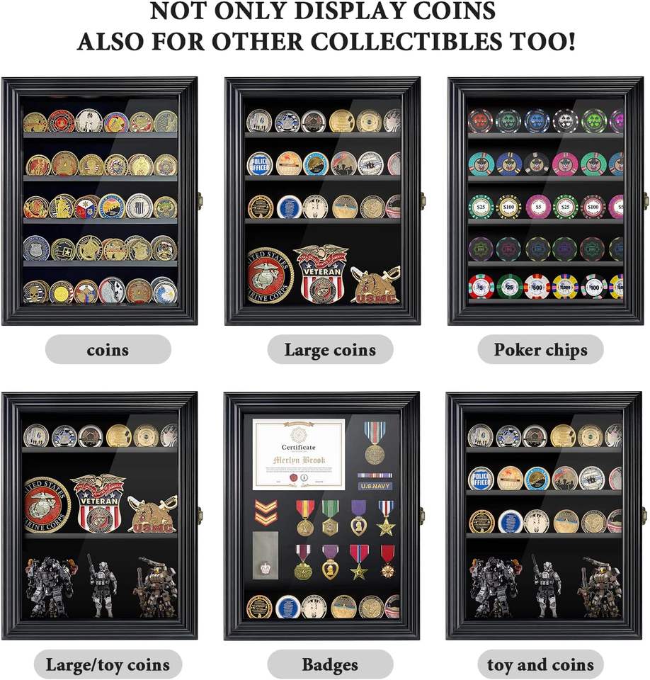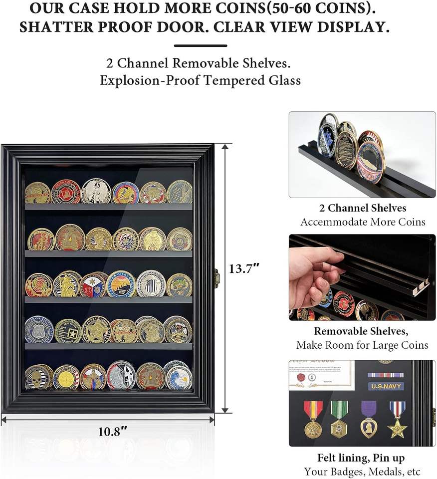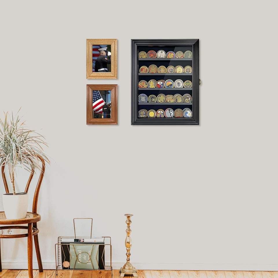 Challenge Coin Holder Vitrine Support Mural avec Verre Bois Médaille Militaire Shadow Box Vitrine avec Étagères Amovibles