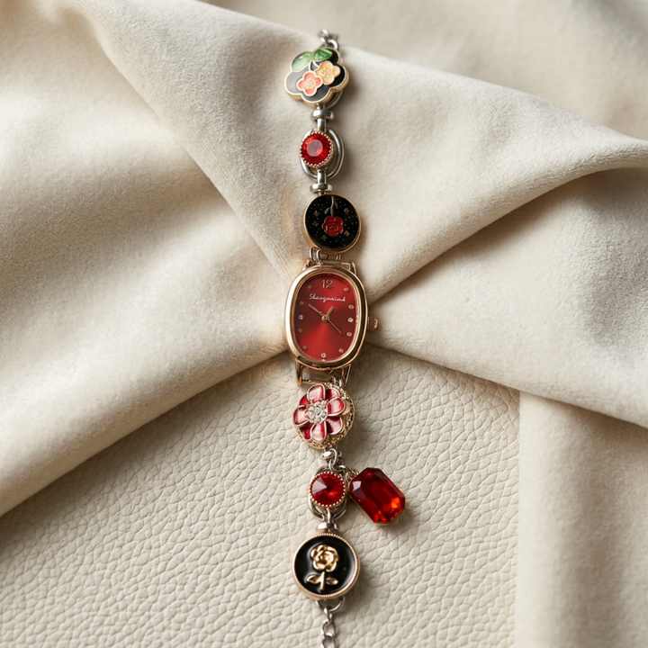 Montre bracelet à breloques | Montre Femme Rétro Rouge Émaillée avec Détails Floraux, Strass Rubis et Perles Faits Main, Mouvement Quartz, Étanche