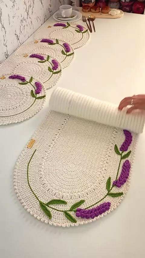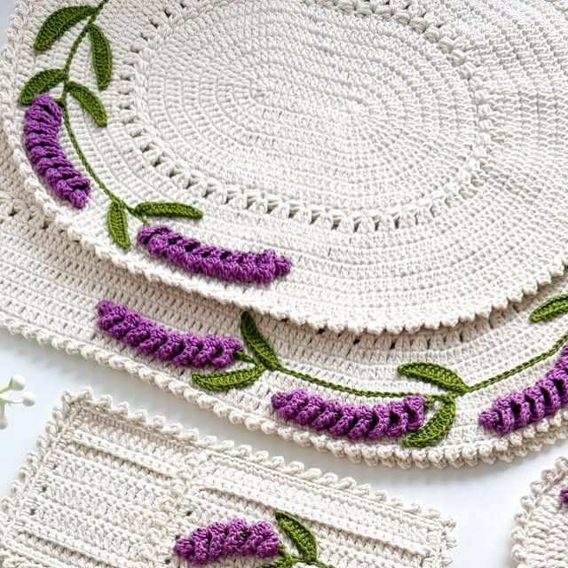 Ensemble de dessous-de-verre en crochet à motif de fleurs de lavande, crème et violet, faits à la main en fil de coton, résistants à la chaleur, style bohème, pour la cuisine, le thé et le café