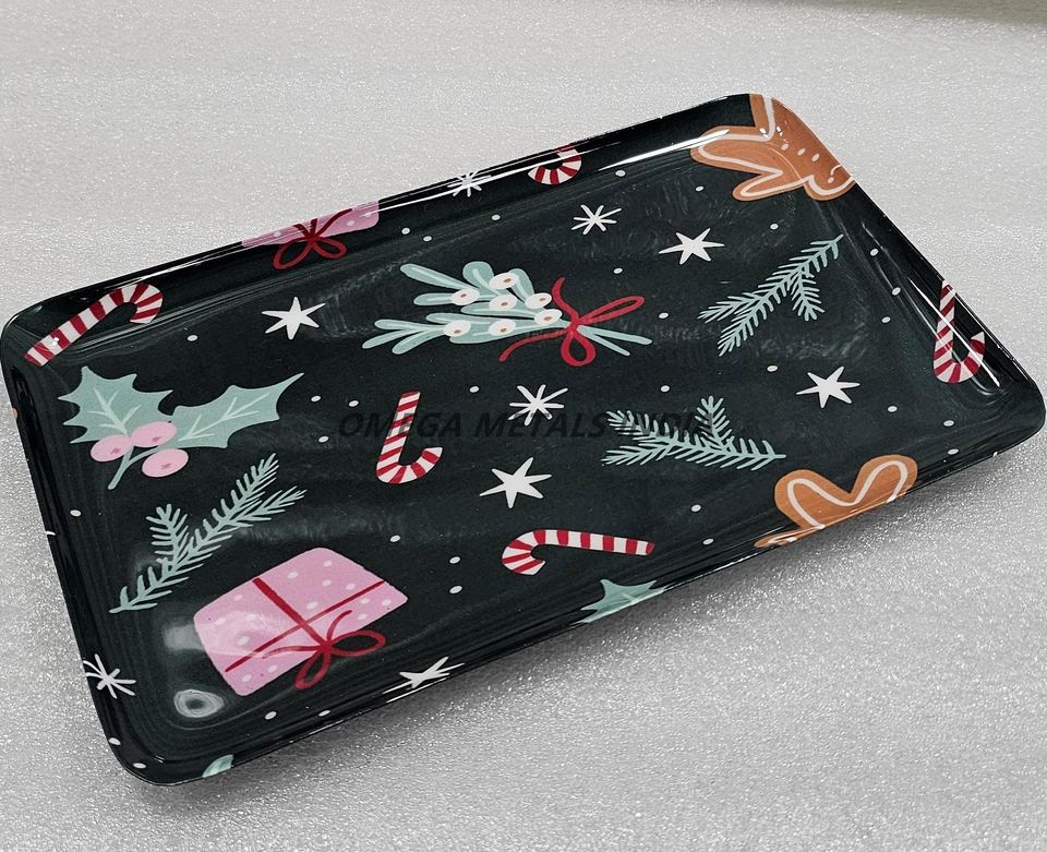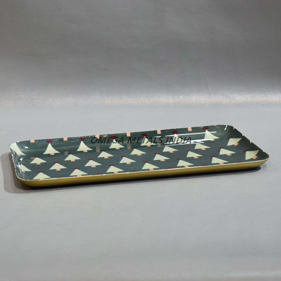 Charmant plateau rectangulaire vert foncé avec arbres de Noël crème idéal pour servir des friandises pendant les vacances