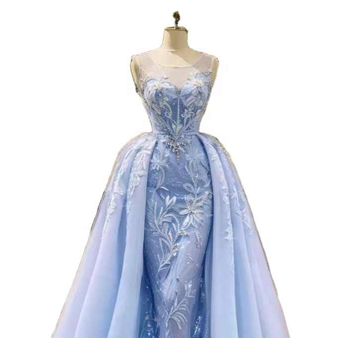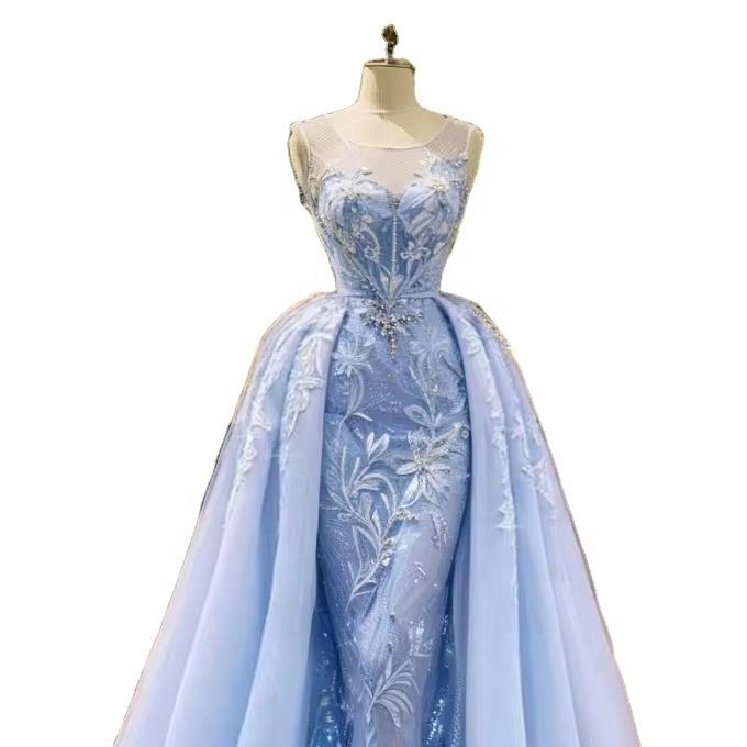 Charmant bleu ciel sirène soirée robe de bal sans manches paillettes robe longue florale avec balayage train