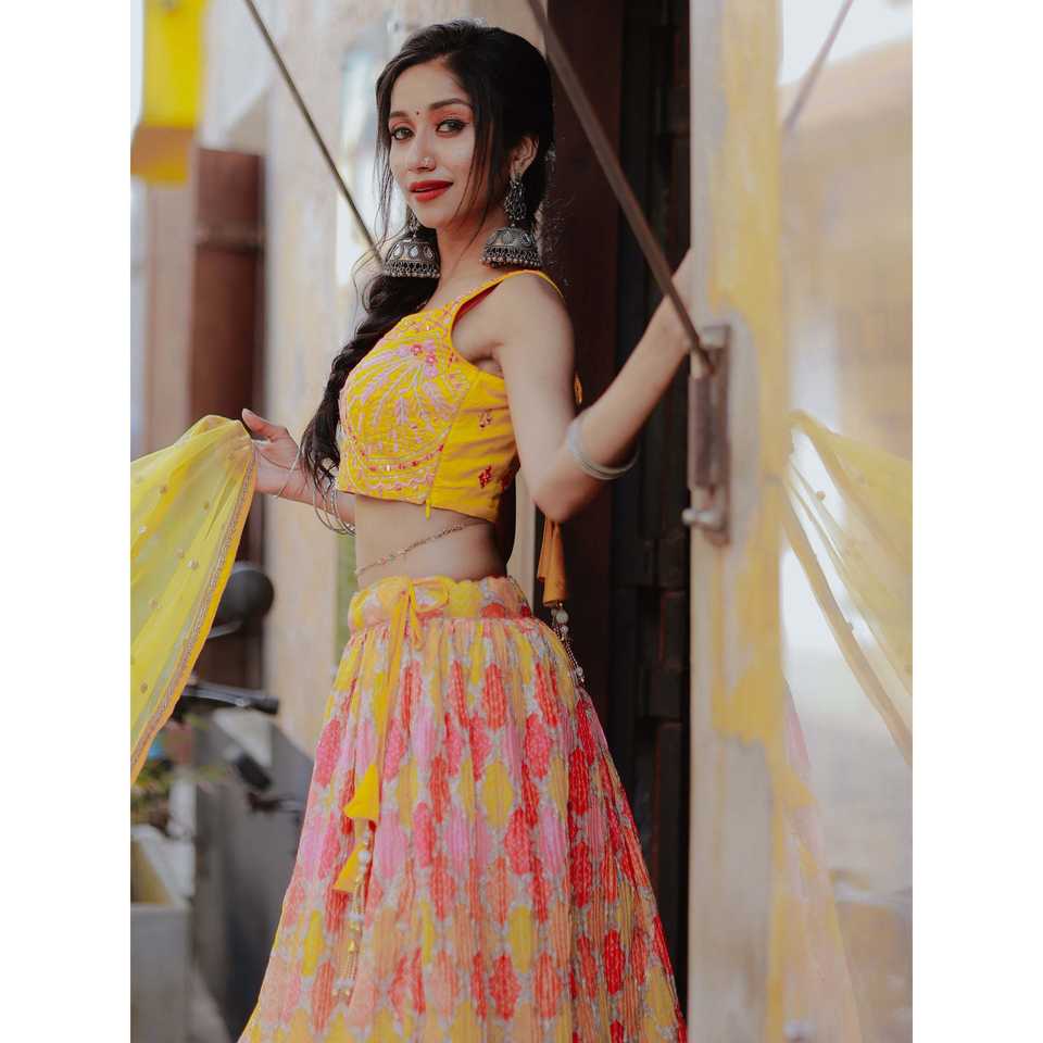Charmant Haldi Wear en organza imprimé jaune Lehenga Choli