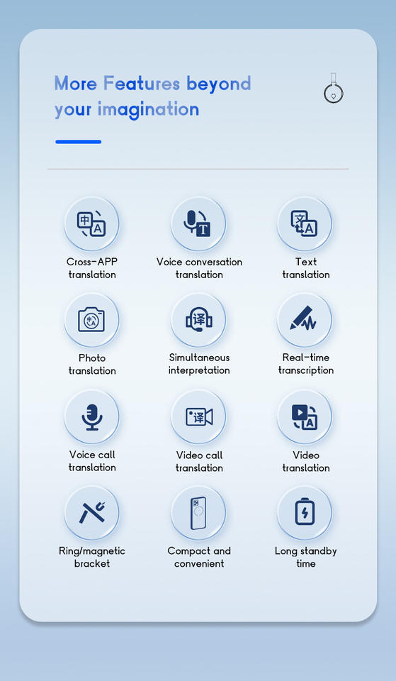 Mini-interprète IA ChatGPT I10 multilingue, compact, avec anneau/aimant, traduction simultanée en temps réel d'images, vidéos et voix