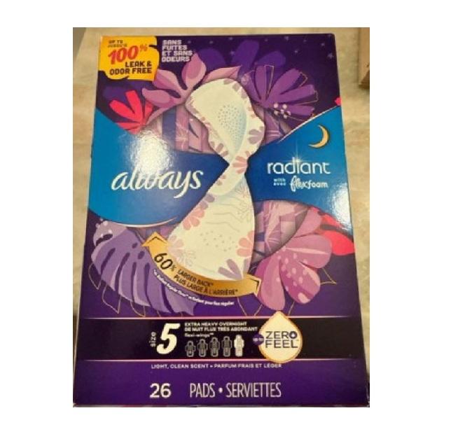 Serviettes hygiéniques Always Radiant pas chères, taille 5, extra lourdes, pour la nuit, lot de 26, distribution en gros, serviettes hygiéniques de haute qualité, offre spéciale maintenant