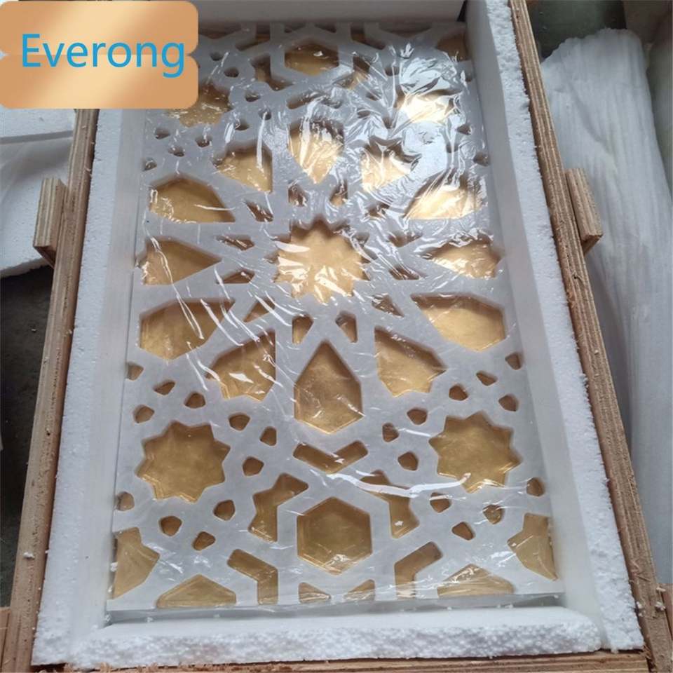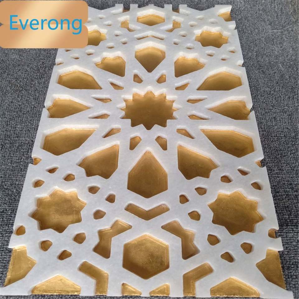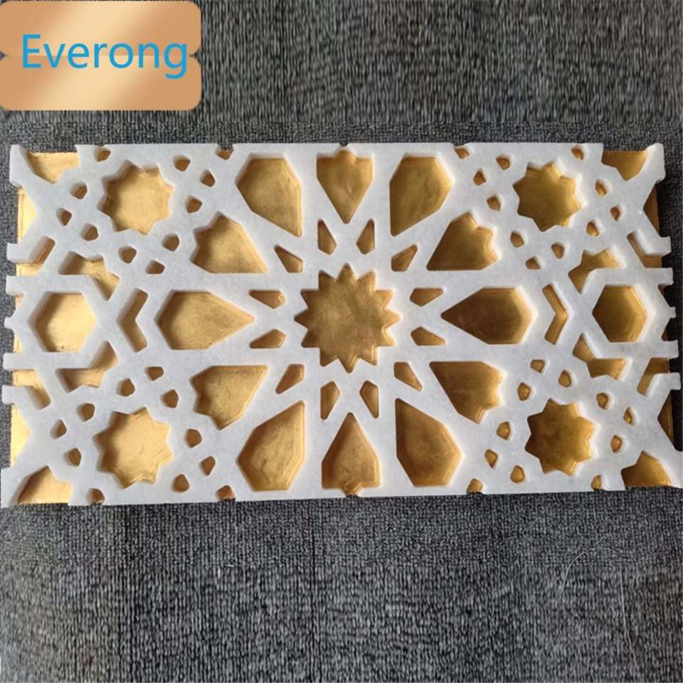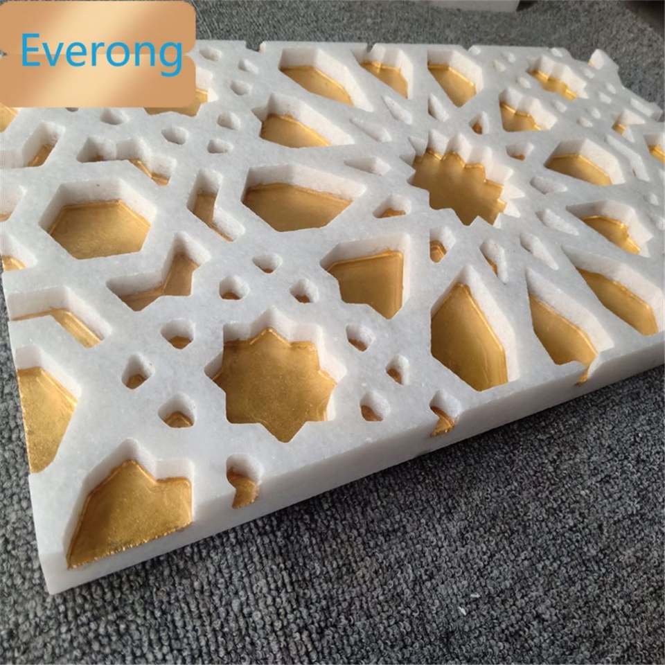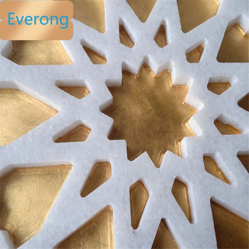 Marbre sculpté bon marché rempli d'or 24K vente chaude incrustation murale Thassos marguerite en marbre blanc matériau jet d'eau véritable métal doré
