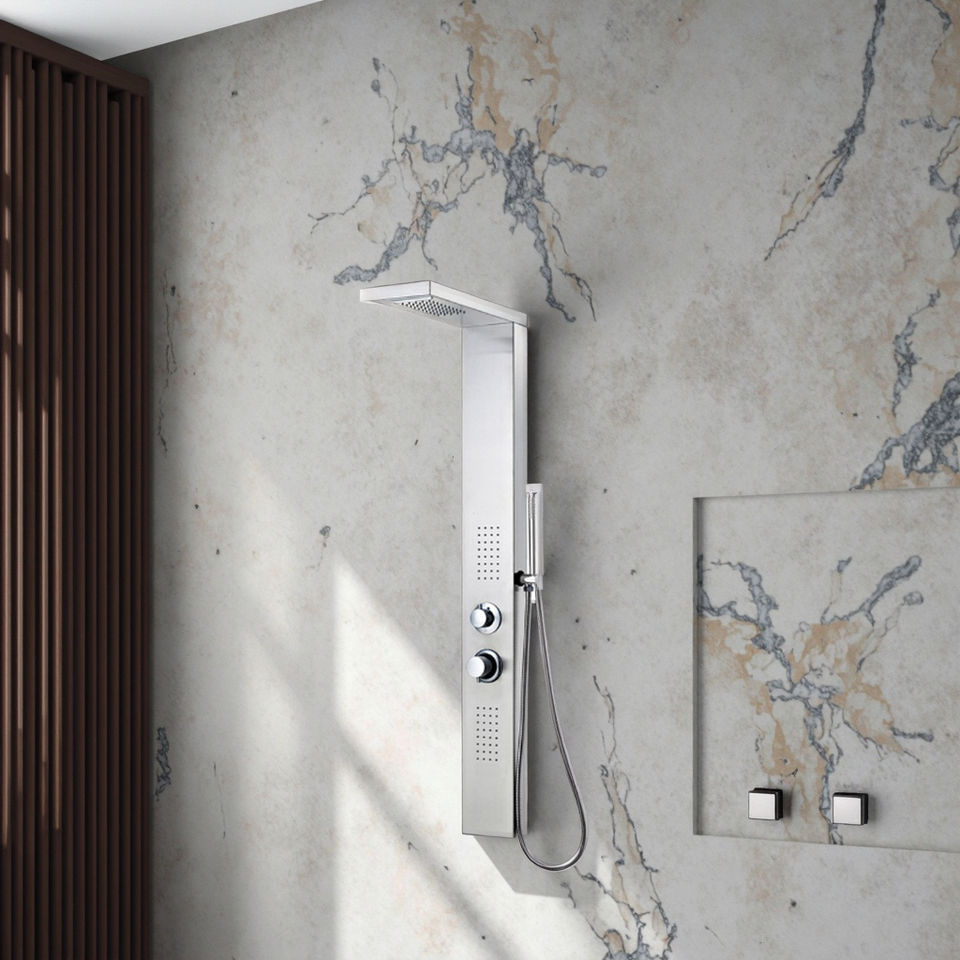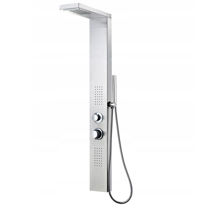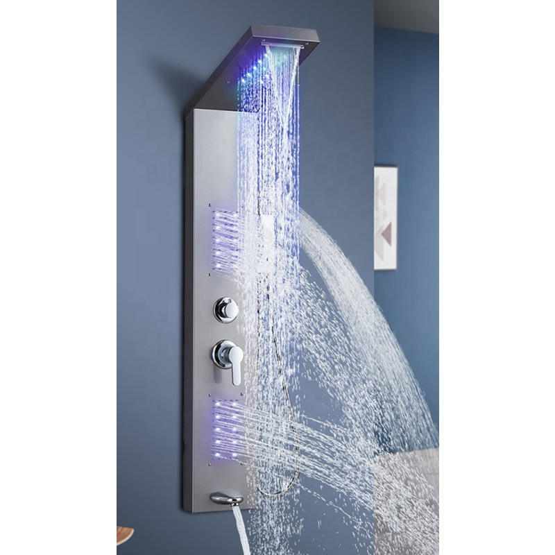 Panneau mural de douche contemporain économique pour villa, en laiton brossé, avec robinet en céramique, jet doux/pluie et massage, pour usage hôtelier, garantie 5 ans