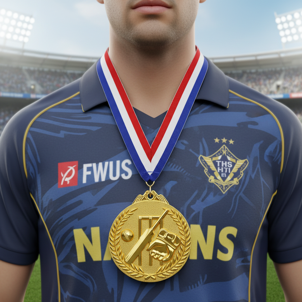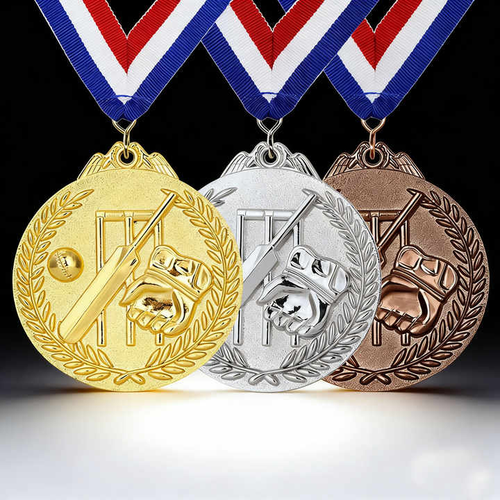 Ensemble de médailles de cricket personnalisées à prix abordable | Médailles de récompense pour tournois de cricket en or/argent/cuivre, vente en gros d'usine, avec logo personnalisé