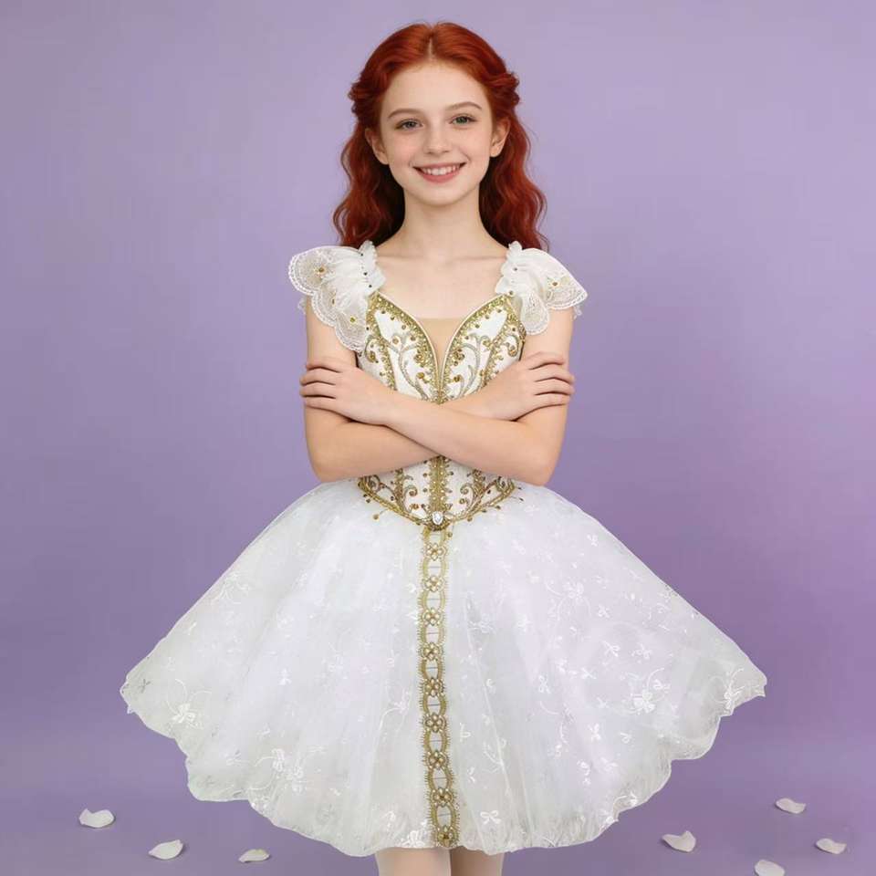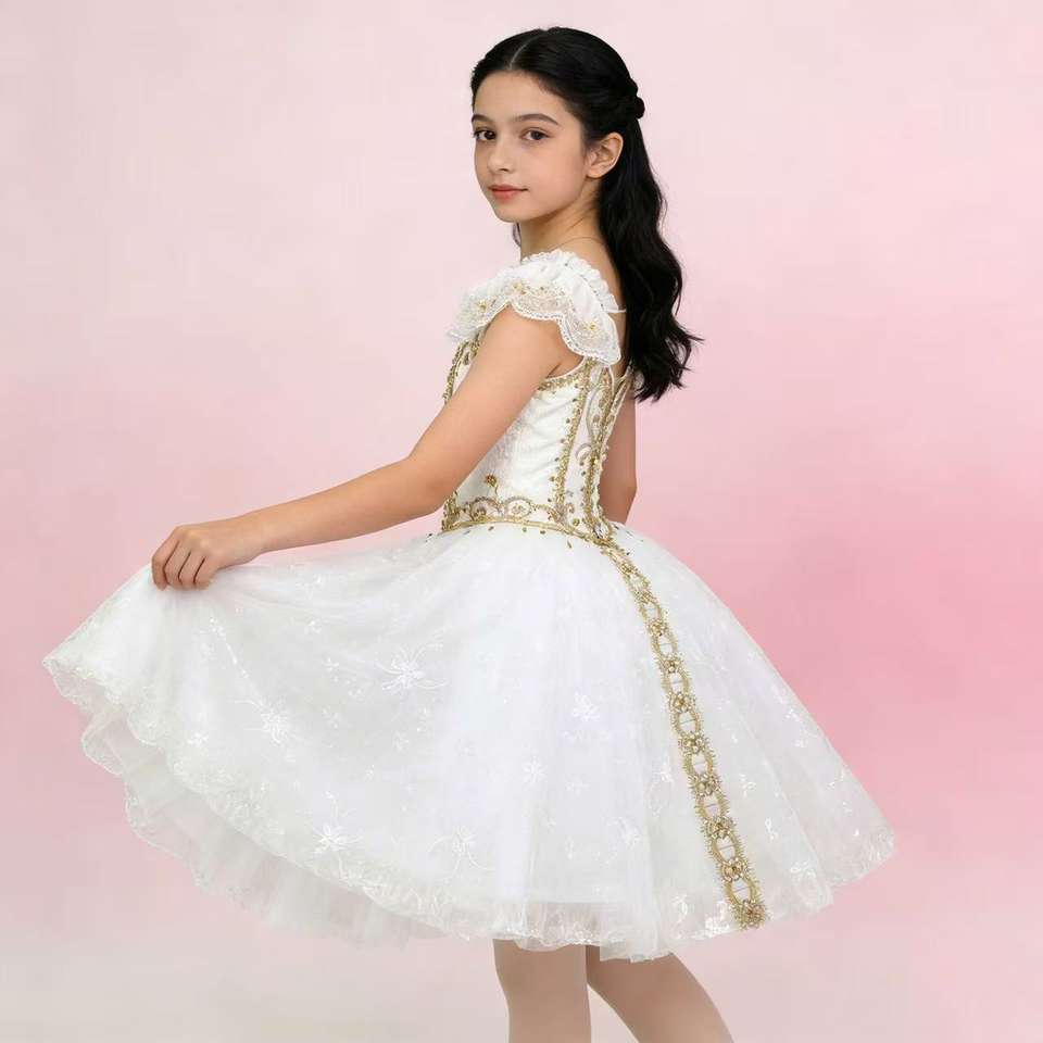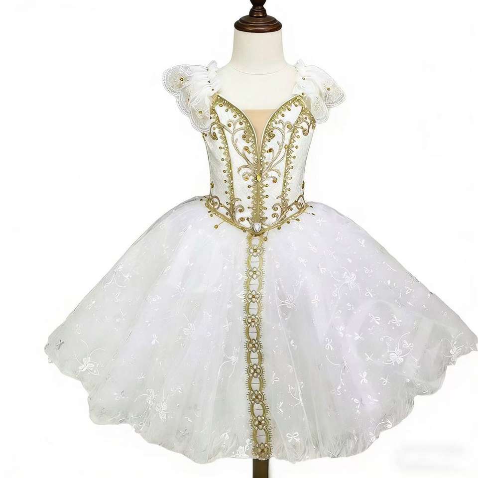 Costume de danse de scène pour enfants de haute qualité et bon marché, motifs blancs dorés, tenue de fête, tutu de ballet professionnel