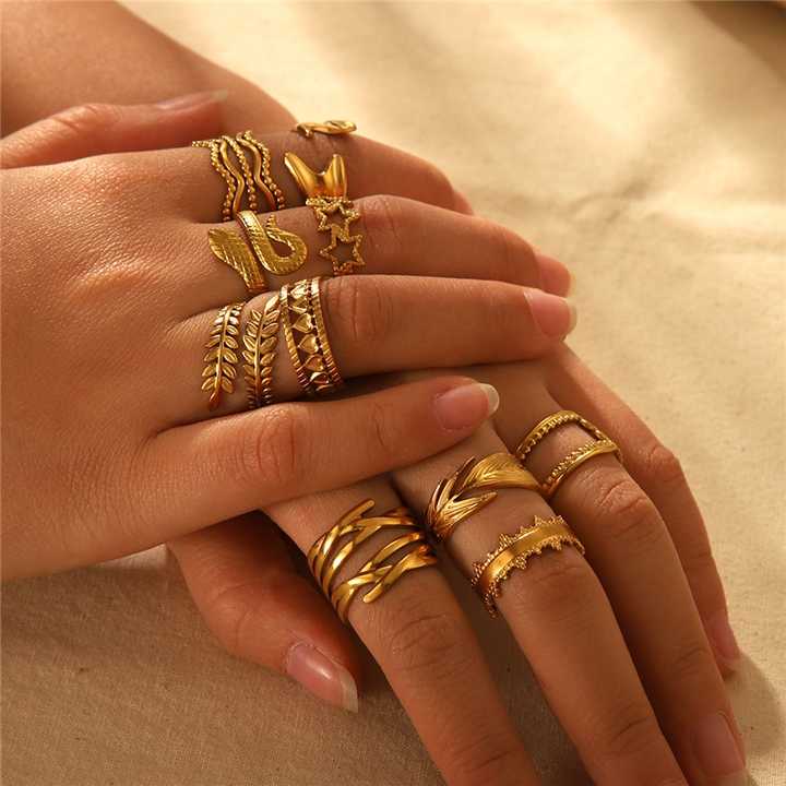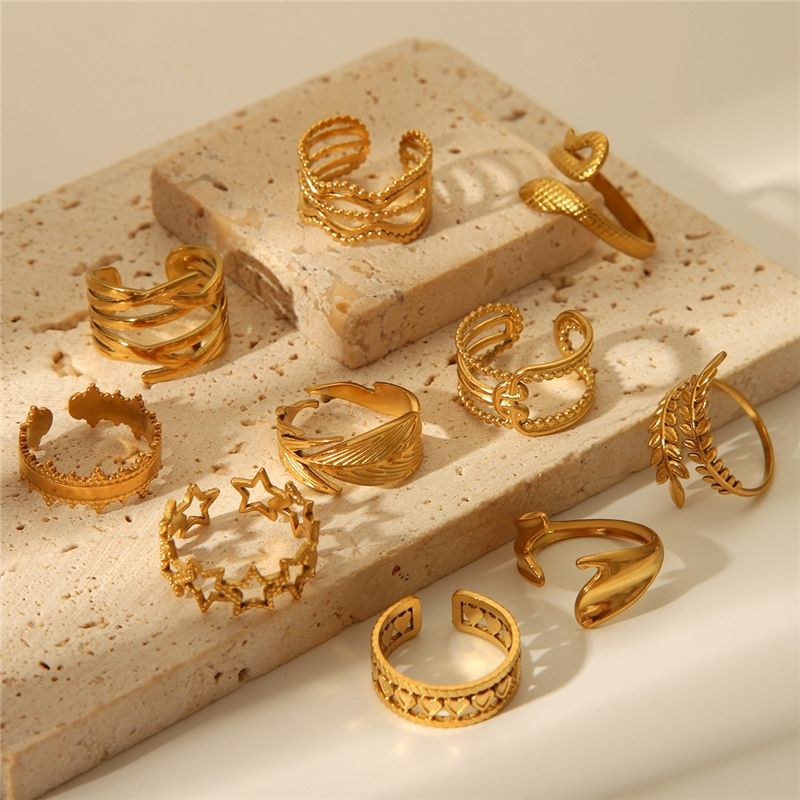 Bague ajustable en acier inoxydable plaqué or 18 carats, motif géométrique serpent, feuilles et plumes, à ouverture par pression, pour femmes et hommes, à prix abordable