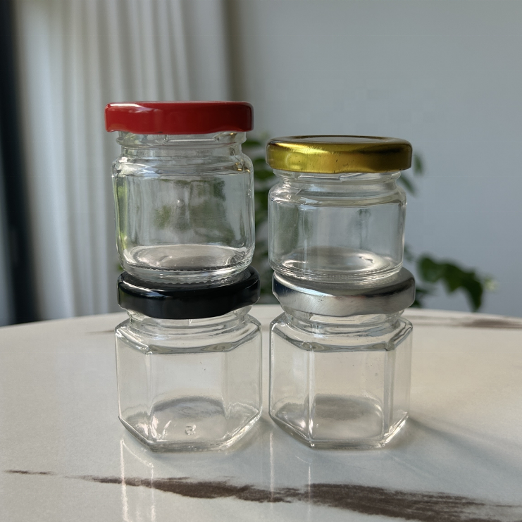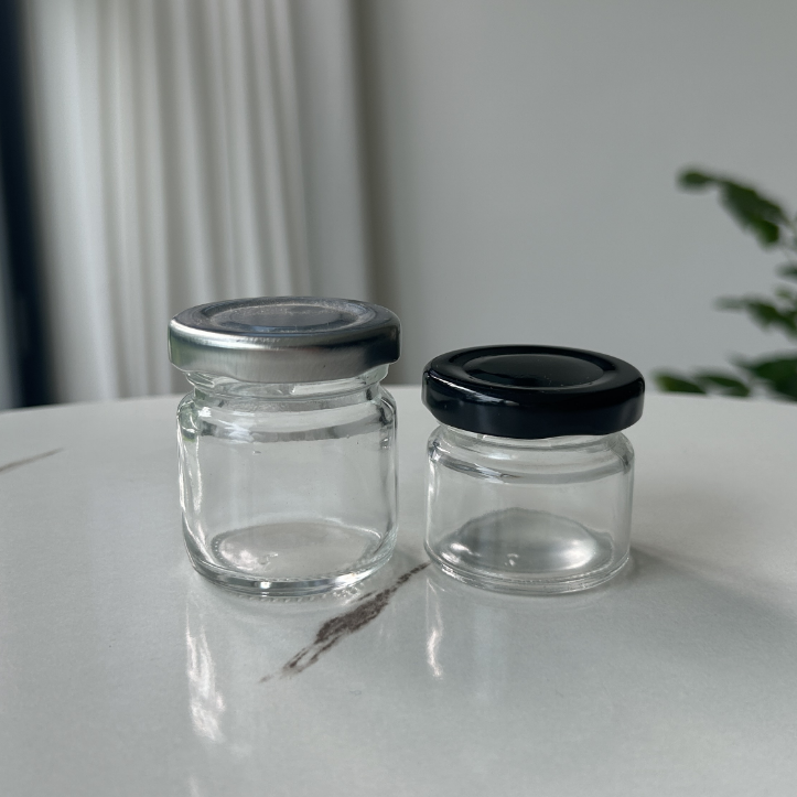 Bon marché, petit pot de nourriture en verre clair rond de 25 ml pour mariage, bougie au miel avec capuchon torsadé noir de 43 mm
