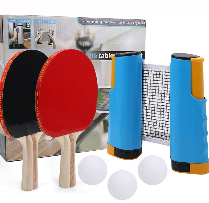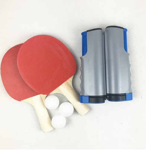 Un ensemble incluent:Un filet, deux raquettes, trois balles