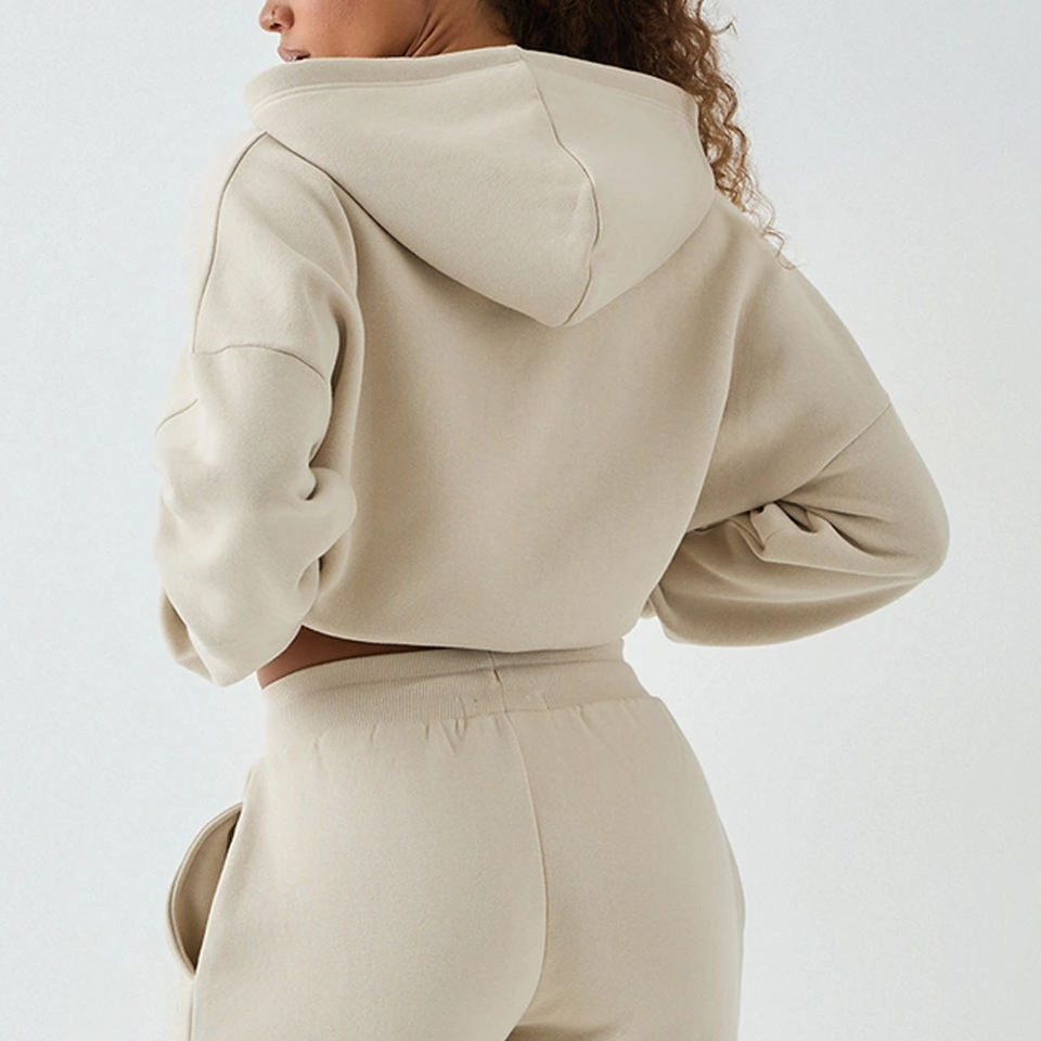 Prix avantageux pour les acheteurs en gros : Haut à capuche court pour femme, design élégant de haute qualité, survêtement avec fermeture éclair et tissu doux