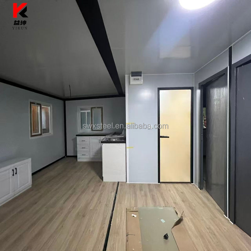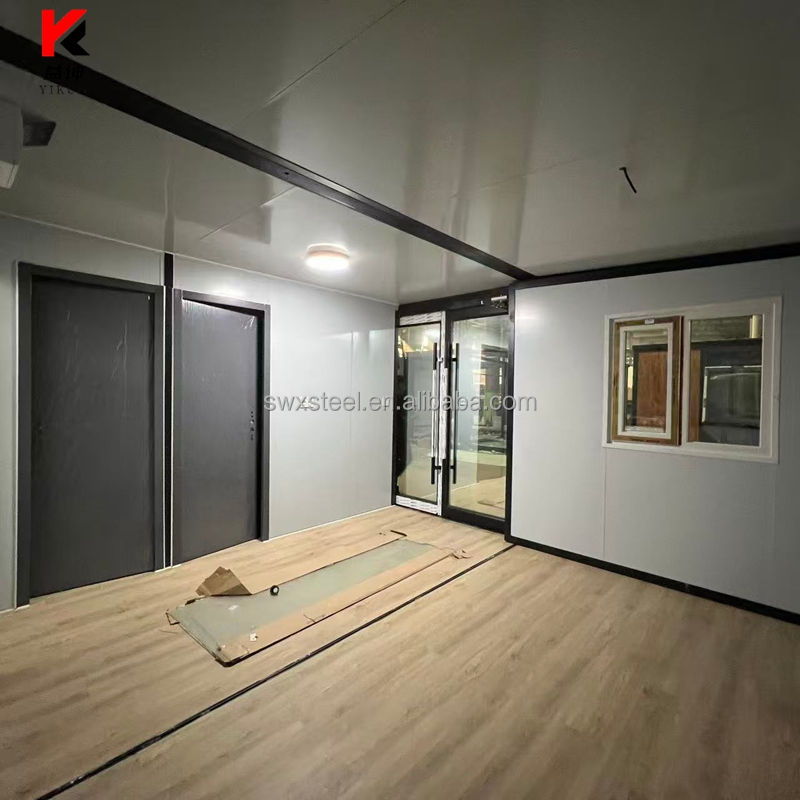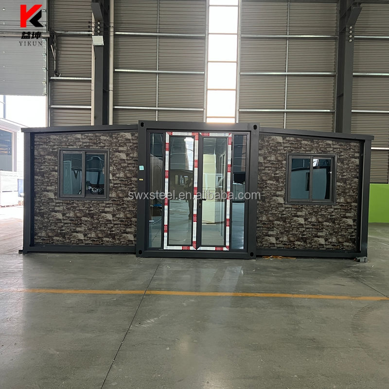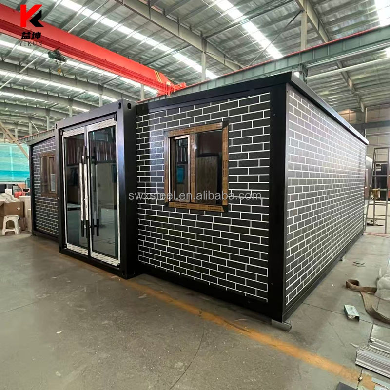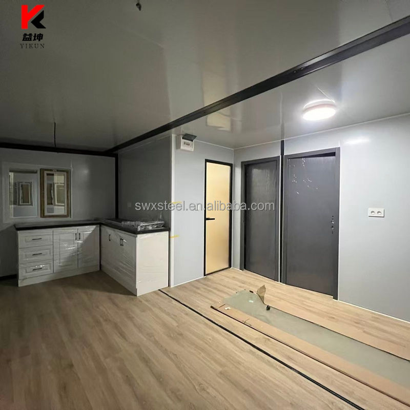 Maison conteneur pliable et extensible en acier préfabriqué, 2 chambres, 1 salle de bain, entièrement meublée, installation rapide et économique, pour usage résidentiel ou bureau.