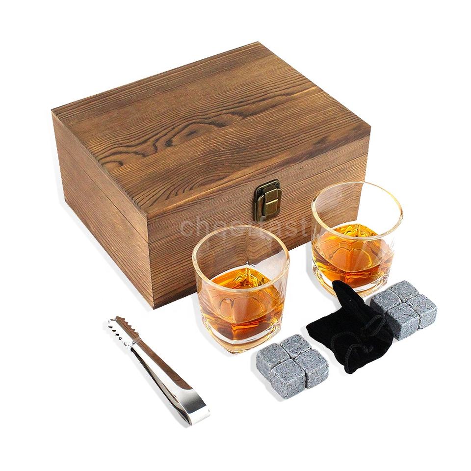 Ensemble cadeau en verre à whisky moins cher 8 pièces ensemble de boîtes en bois de granit pierres à whisky avec kit de verre pierre de refroidissement réutilisable pour le whisky