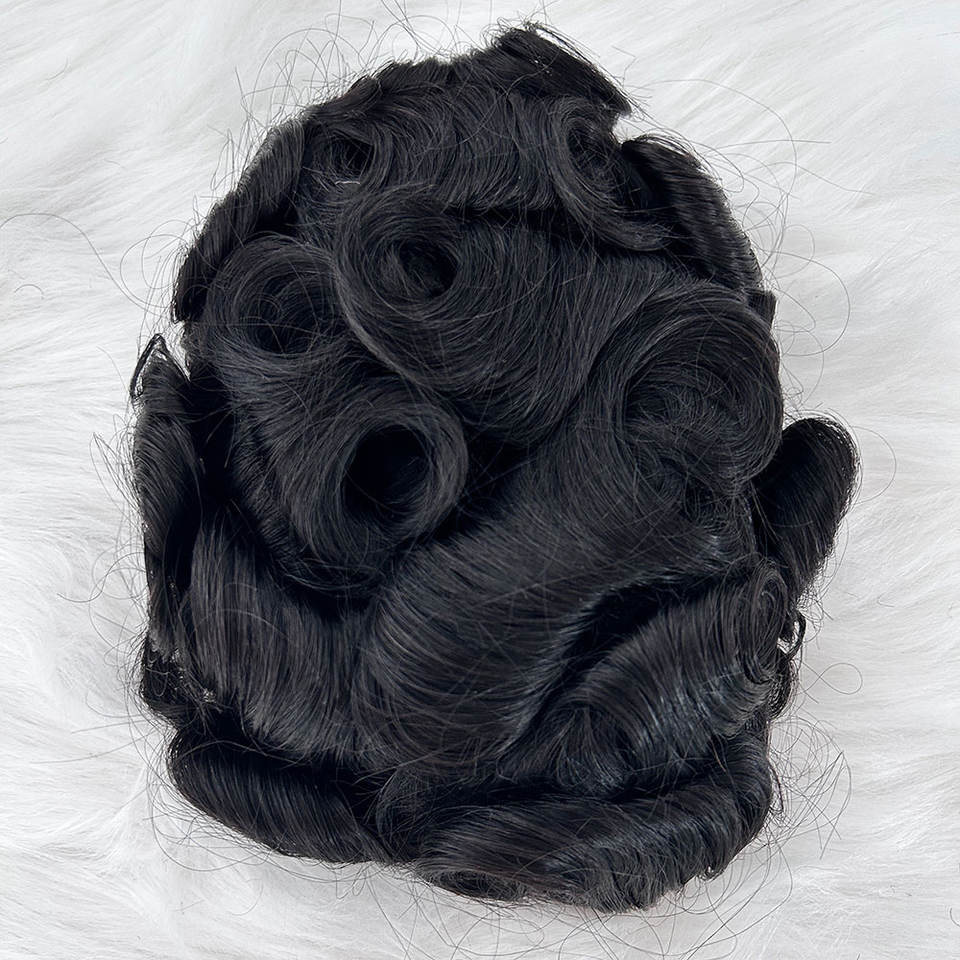 Moins cher indien remy postiches fabrique naturel noir bouclé vague mince peau permanente mono + pu remplacement de cheveux hommes toupet