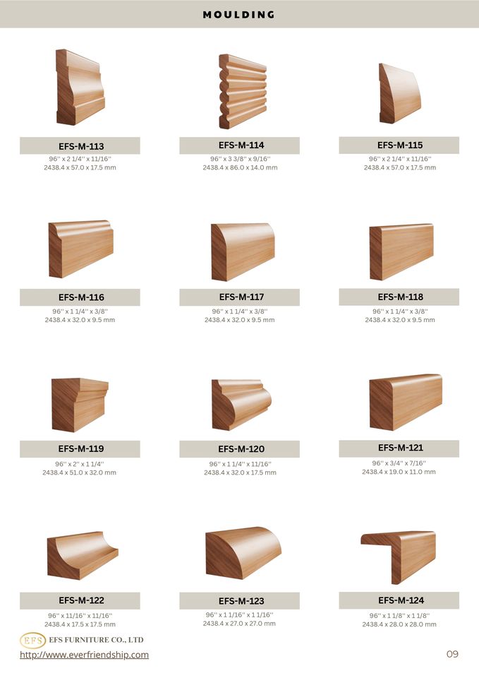 Couronnes murales, plinthes, fenêtres, escaliers, mobilier intérieur,...
