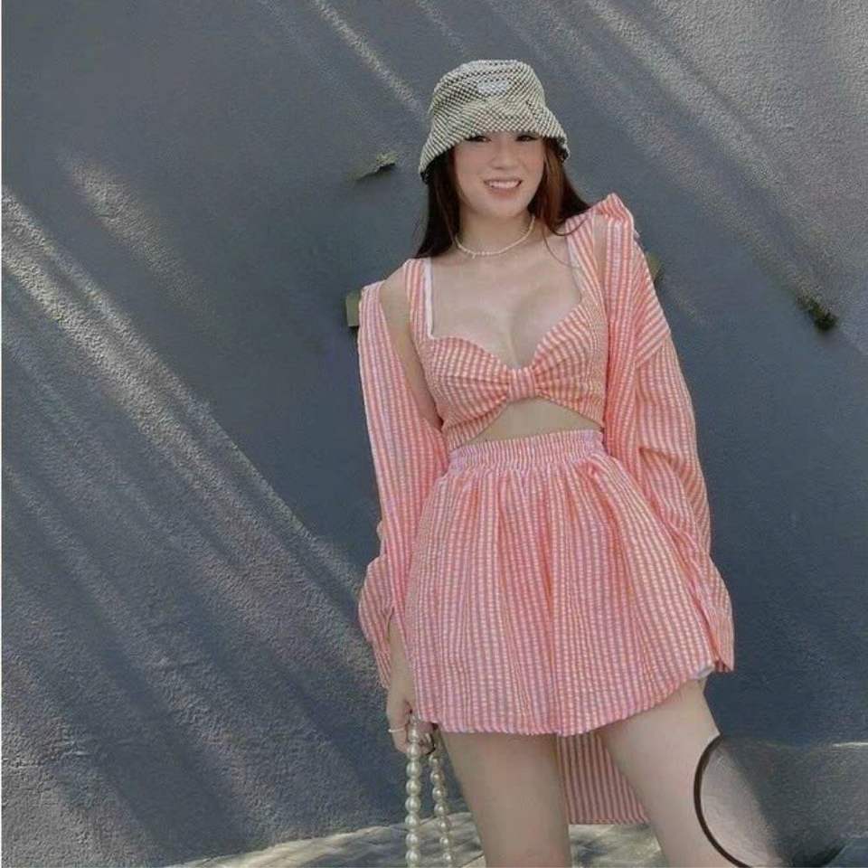 Chic 3-Piece Beach Set with Shirt, Skirt, and Bow Crop Top - Perfect for Sunny Days by the Sea Bulk From Vietnam