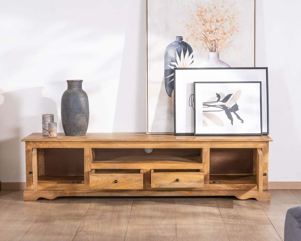 Meuble TV en bois de manguier de style campagnard chic de 180 cm Sarah-Design moderne pour salon, hôtel et chambre à coucher pour une utilisation en appartement