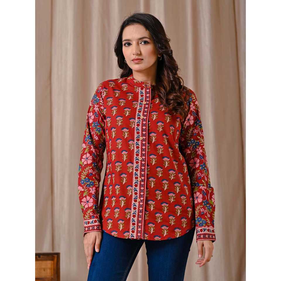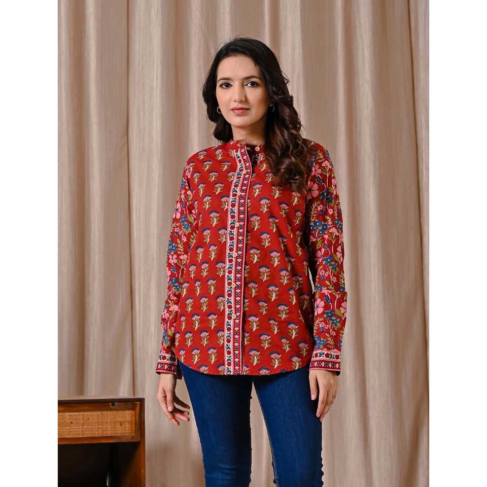 Top chic en coton imprimé Butta rouge foncé pour femmes, col asymétrique, boutons sur le devant, dentelle brodée florale, longueur courte, taille XL