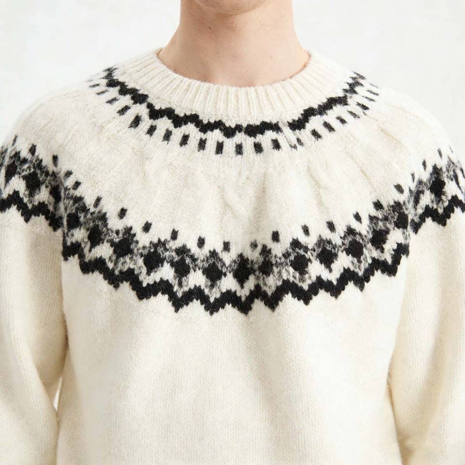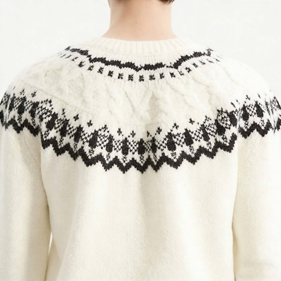 Pull chic pour homme en maille Fair Isle blanche, col rond, tricot doux, pull décontracté d'hiver avec logo personnalisé, pull élégant de haute qualité