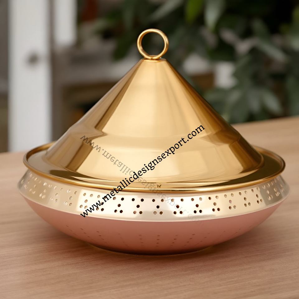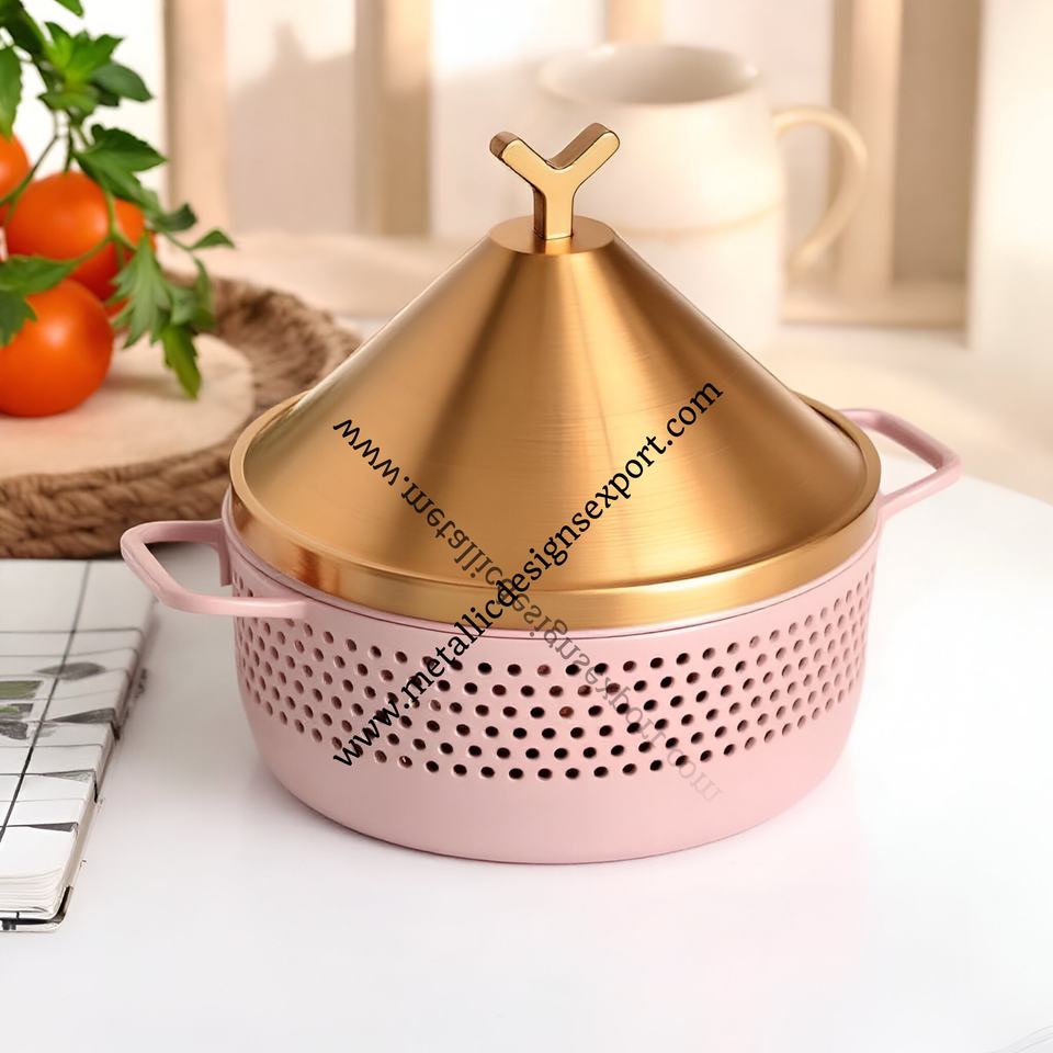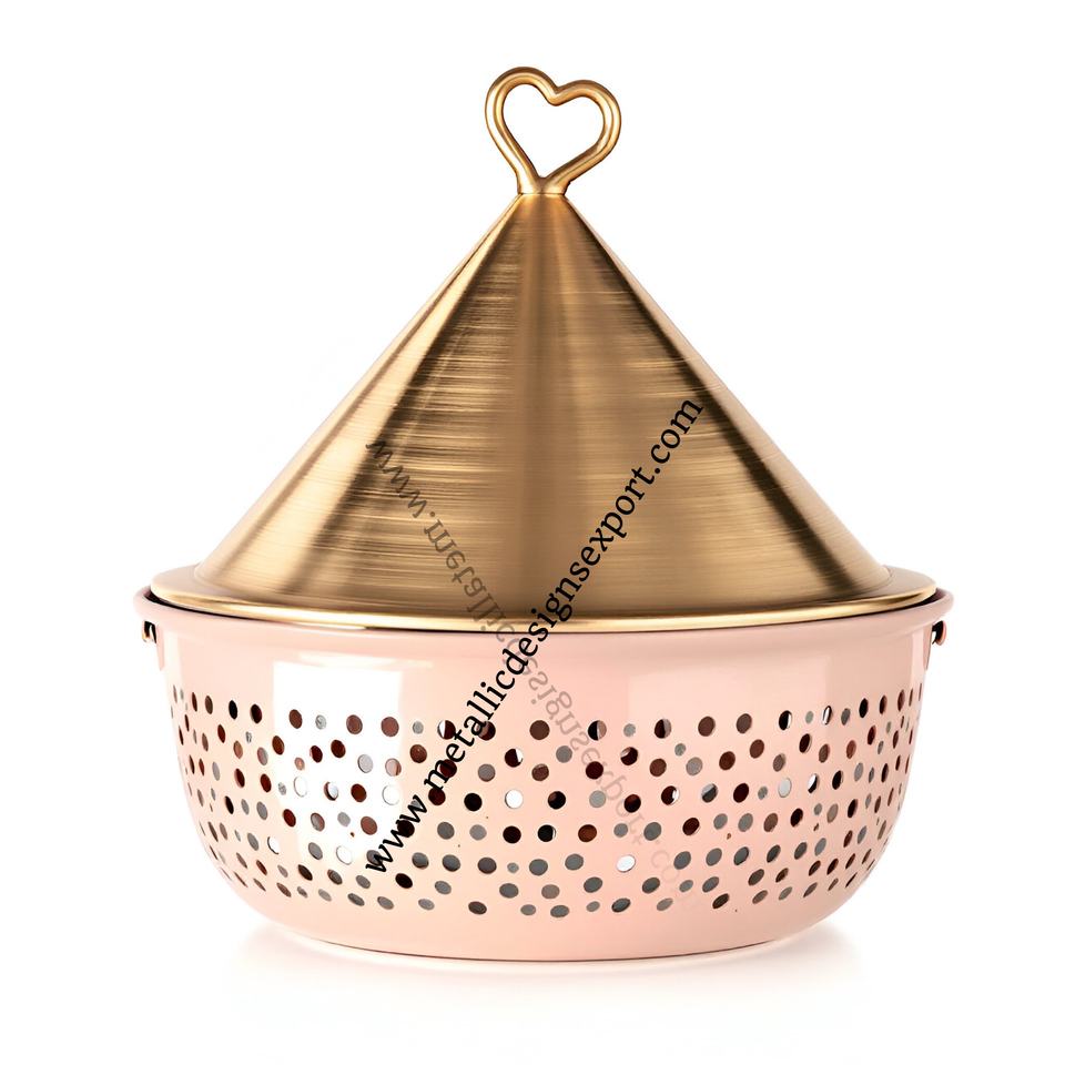 Plat de service et casserole en forme de cône à poignée en coeur chic avec couvercle Base rose perforée Vaisselle moderne Plats à friction Taille personnalisée