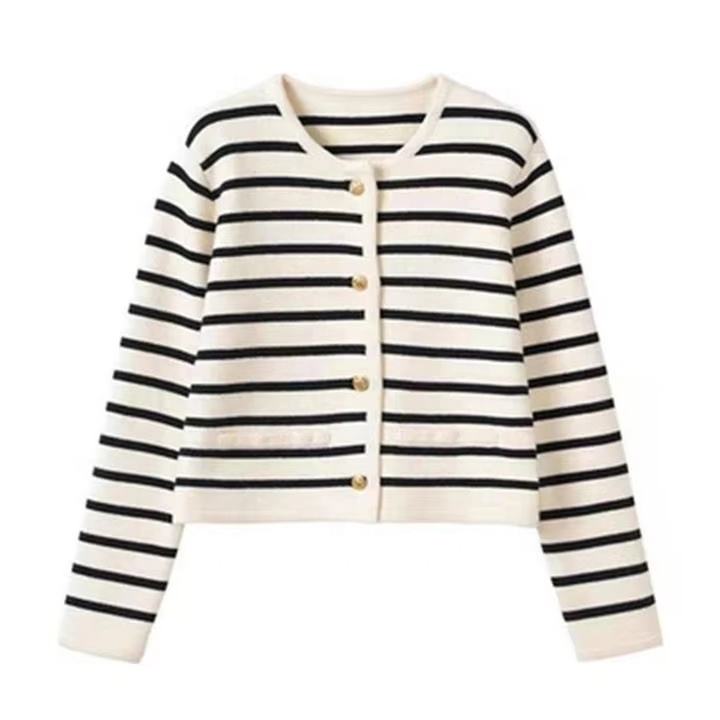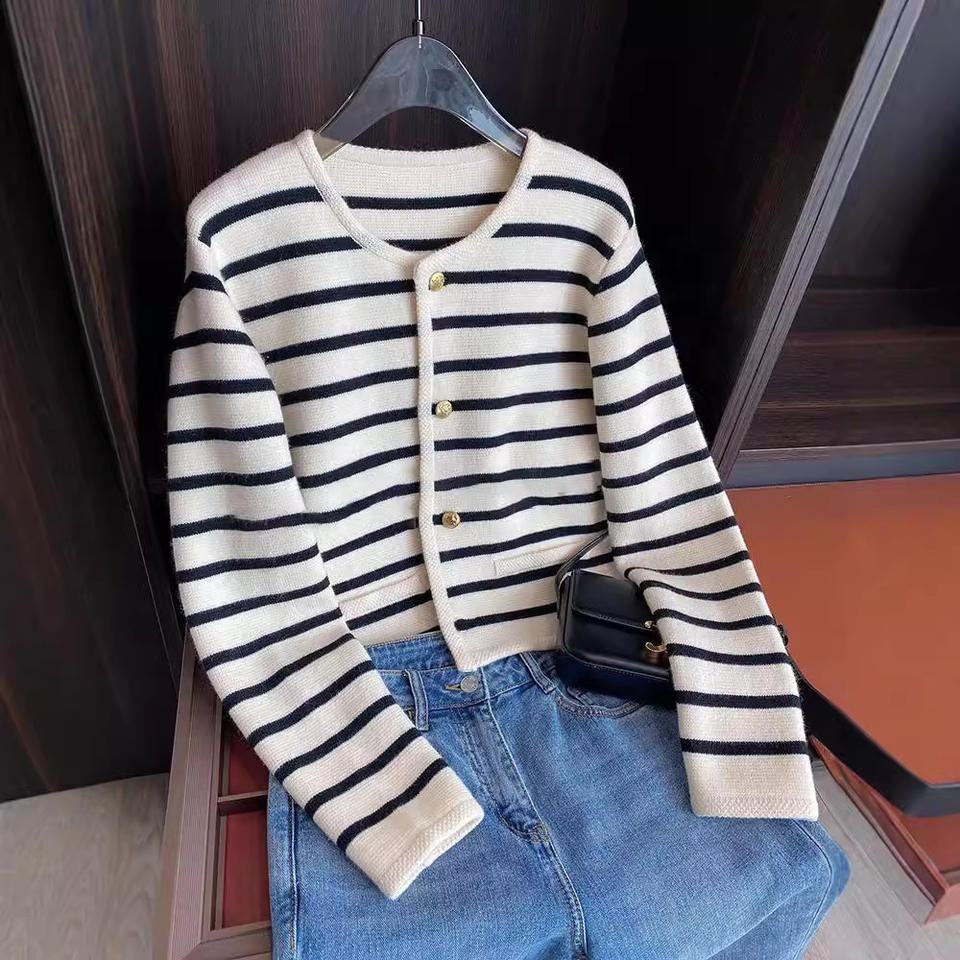 Cardigan en tricot rayé chic de style parisien pour femmes, doux, confortable, manches longues, léger, décontracté, élégant, boutonné sur le devant